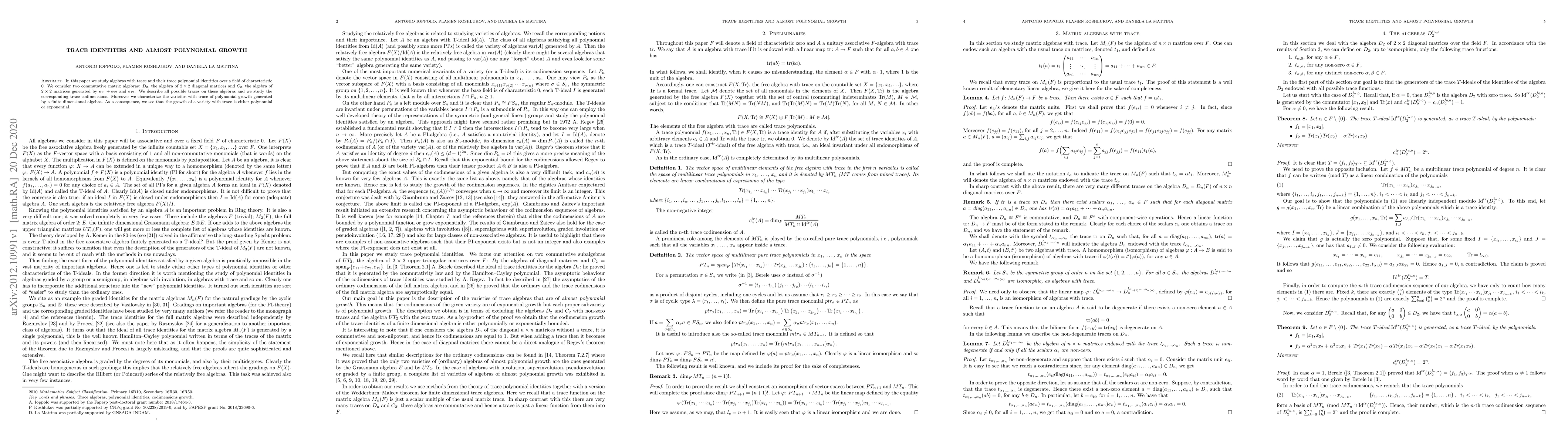 The paper studies trace identities and almost polynomial growth in algebras with trace over a field of characteristic 0, focusing on two commutative matrix algebras: $D_2$ (2x2 diagonal matrices) and $C_2$ (generated by $e_{11}+e_{22}$ and $e_{12}$). It describes all possible traces on these algebras, studies trace codimensions, and characterizes varieties with trace of polynomial growth generated by a finite-dimensional algebra.