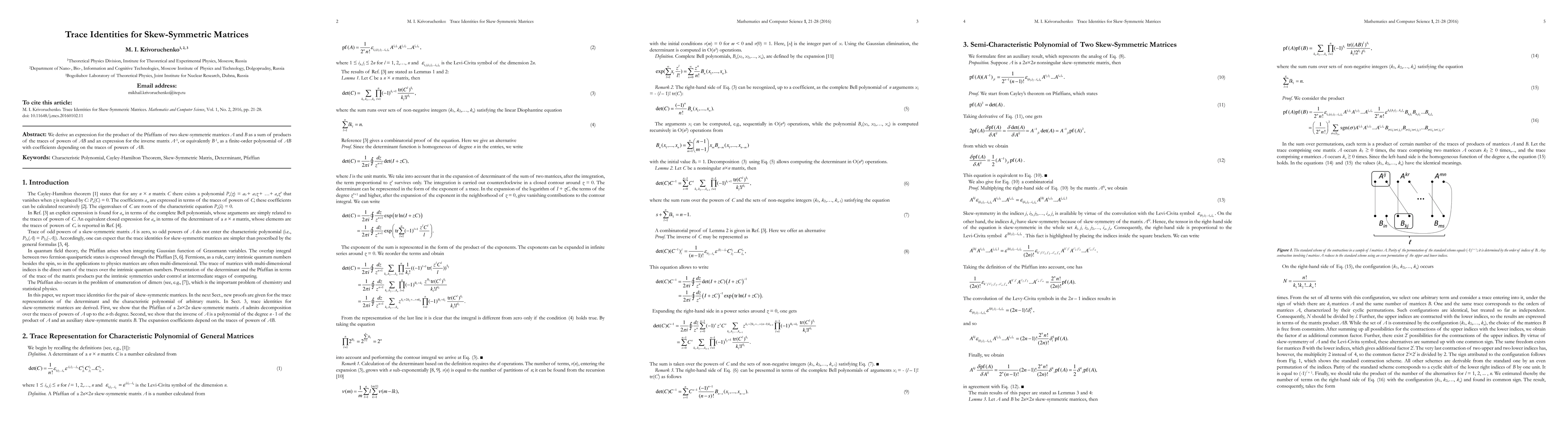 We derive an expression for the product of the Pfaffians of two skew-symmetric matrices A and B as a sum of products of the traces of powers of AB and an expression for the inverse matrix A$^{-1}$, or equivalently B$^{-1}$, as a finite-order polynomial of AB with coefficients depending on the traces of powers of AB.