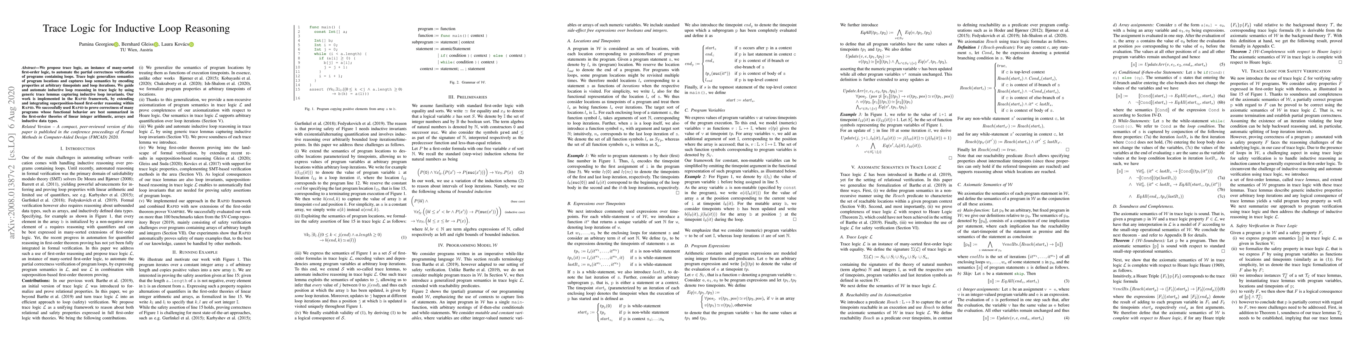 We propose trace logic, an instance of many-sorted first-order logic, to automate the partial correctness verification of programs containing loops. Trace logic generalizes semantics of program locations and captures loop semantics by encoding properties at arbitrary timepoints and loop iterations. We guide and automate inductive loop reasoning in trace logic by using generic trace lemmas capturing inductive loop invariants. Our work is implemented in the RAPID framework, by extending and integrating superposition-based first-order reasoning within RAPID. We successfully used RAPID to prove correctness of many programs whose functional behavior are best summarized in the first-order theories of linear integer arithmetic, arrays and inductive data types.