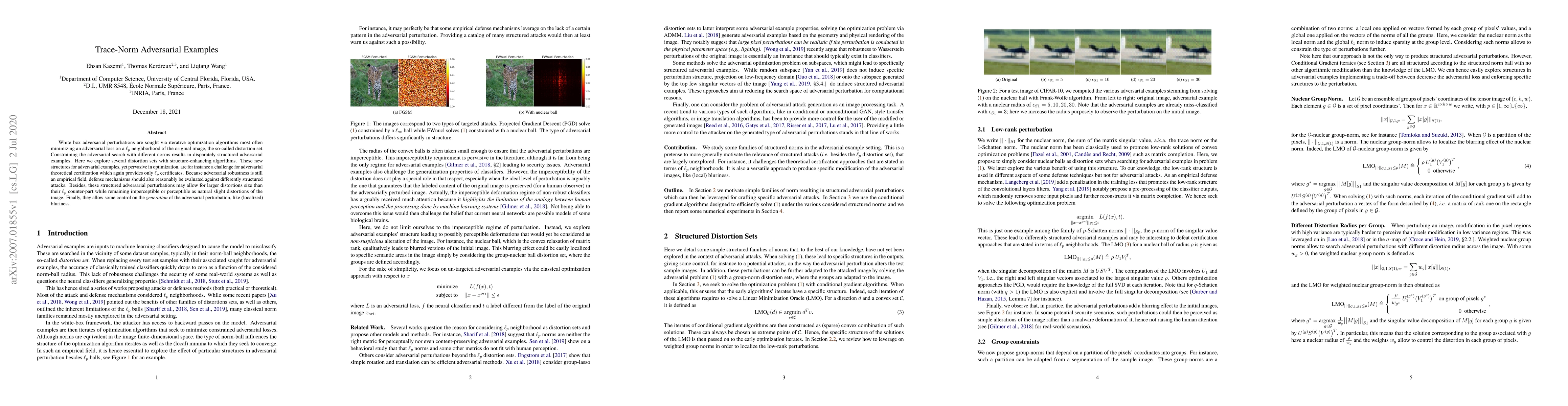 The paper introduces trace-norm adversarial examples and structure-enhancing algorithms, demonstrating their potential for larger distortions and controllable perturbation characteristics.