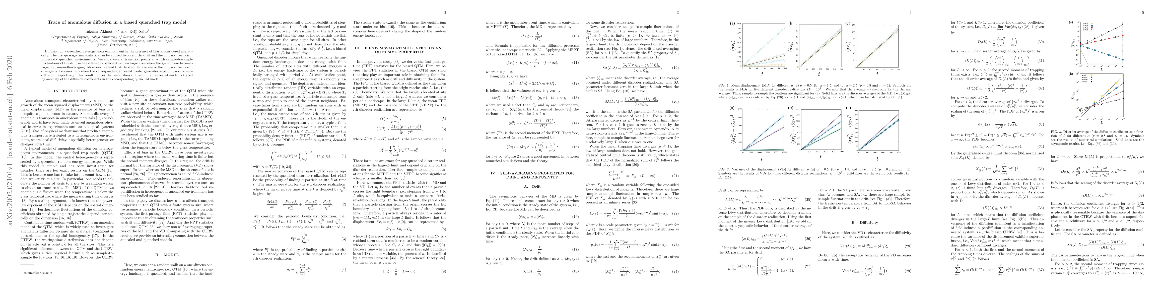 This paper analytically investigates diffusion in a biased quenched trap model, revealing non-self-averaging behavior and transition points where fluctuations persist. It finds that anomalous diffusion in the annealed model is mirrored by anomalies in the diffusion coefficients of the quenched model.