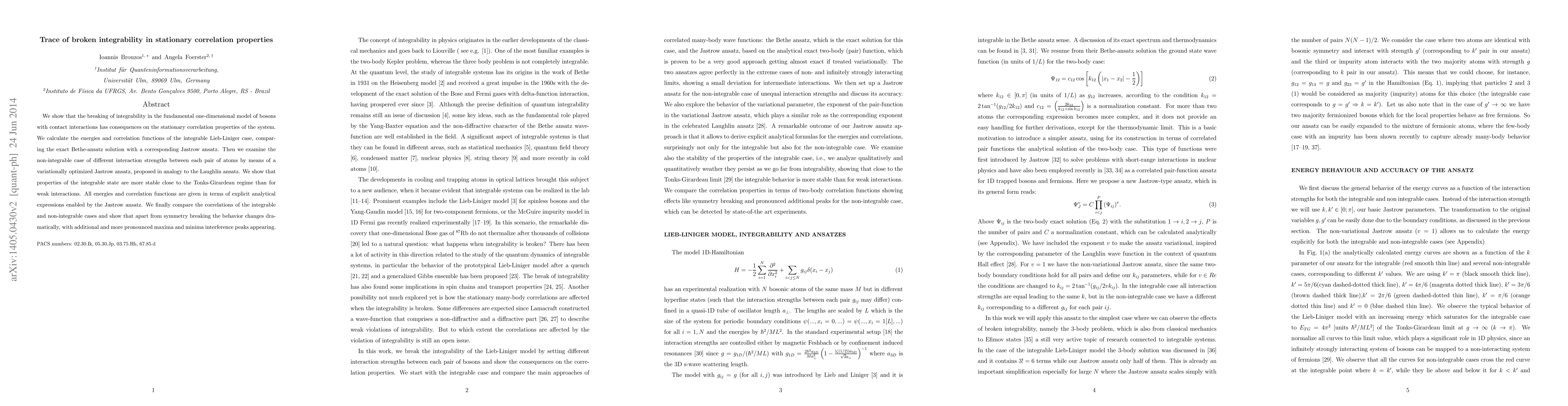 We show that the breaking of integrability in the fundamental one-dimensional model of bosons with contact interactions has consequences on the stationary correlation properties of the system. We calculate the energies and correlation functions of the integrable Lieb-Liniger case, comparing the exact Bethe-ansatz solution with a corresponding Jastrow ansatz. Then we examine the non-integrable case of different interaction strengths between each pair of atoms by means of a variationally optimized Jastrow ansatz, proposed in analogy to the Laughlin ansatz. We show that properties of the integrable state are more stable close to the Tonks-Girardeau regime than for weak interactions. All energies and correlation functions are given in terms of explicit analytical expressions enabled by the Jastrow ansatz. We finally compare the correlations of the integrable and non-integrable cases and show that apart from symmetry breaking the behavior changes dramatically, with additional and more pronounced maxima and minima interference peaks appearing.