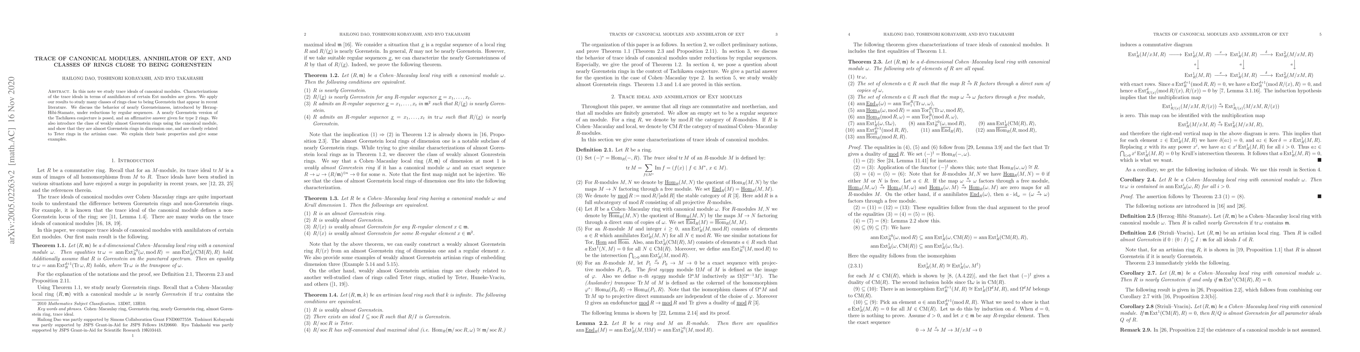 In this note we study trace ideals of canonical modules. Characterizations of the trace ideals in terms of annihilators of certain Ext modules are given. We apply our results to study many classes of rings close to being Gorenstein that appear in recent literature. We discuss the behavior of nearly Gorensteinness, introduced by Herzog-Hibi-Stamate, under reductions by regular sequences. A nearly Gorenstein version of the Tachikawa conjecture is posed, and an affirmative answer given for type 2 rings. We also introduce the class of weakly almost Gorenstein rings using the canonical module, and show that they are almost Gorenstein rings in dimension one, and are closely related to Teter rings in the artinian case. We explain their basic properties and give some examples.