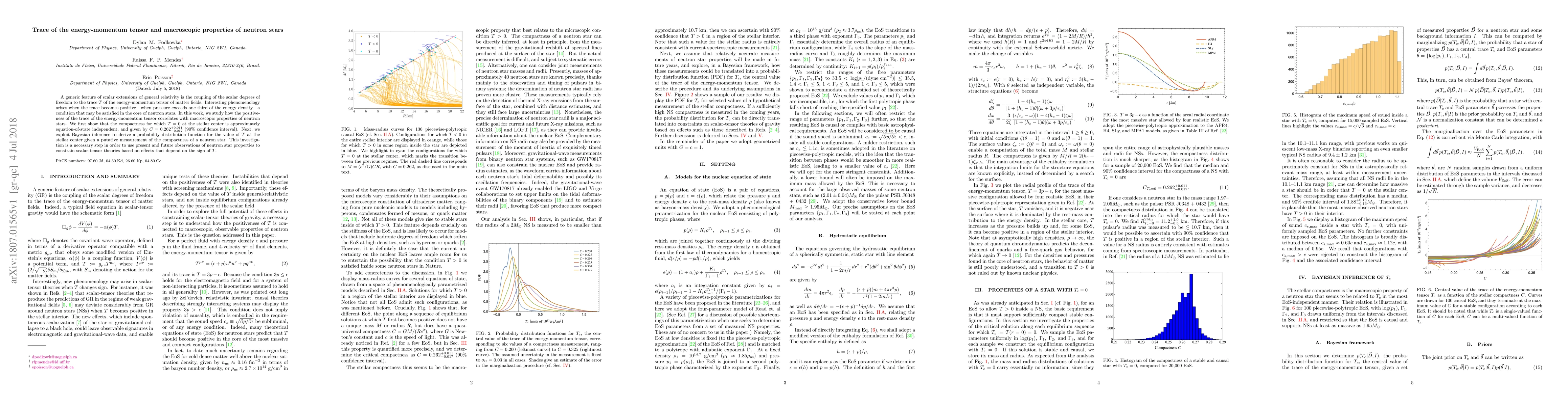 This paper investigates the correlation between the positive trace of the energy-momentum tensor and macroscopic properties of neutron stars in scalar extensions of general relativity. It finds that the compactness for $T=0$ at the stellar center is approximately $0.262$ (90% confidence interval) and uses Bayesian inference to determine the probability distribution of $T$ based on neutron star compactness.