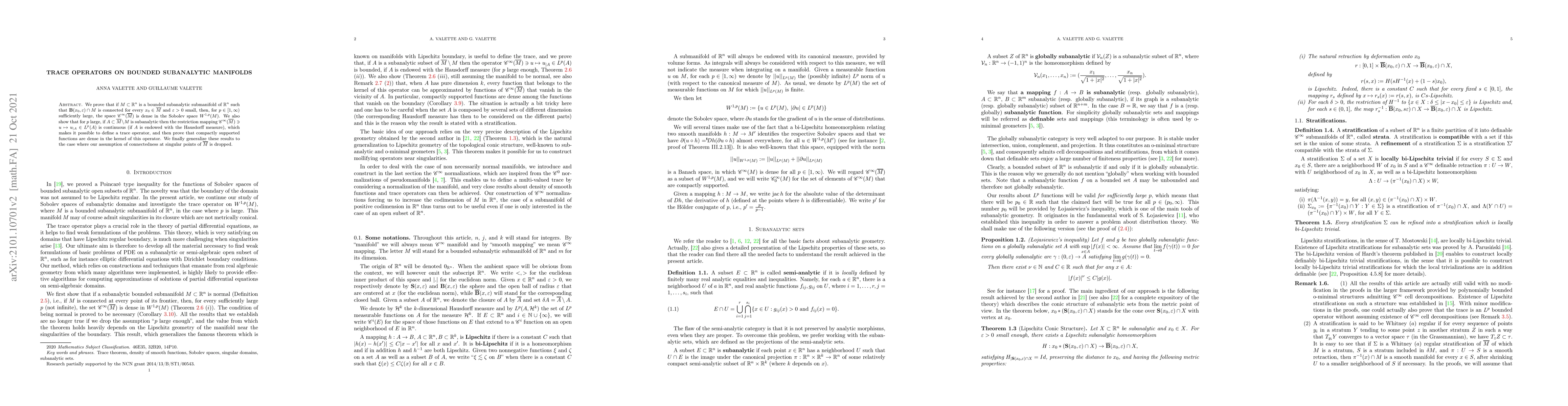 Researchers prove that on certain subanalytic manifolds, functions in a specific function space can be approximated closely, enabling the definition of a trace operator with useful properties.