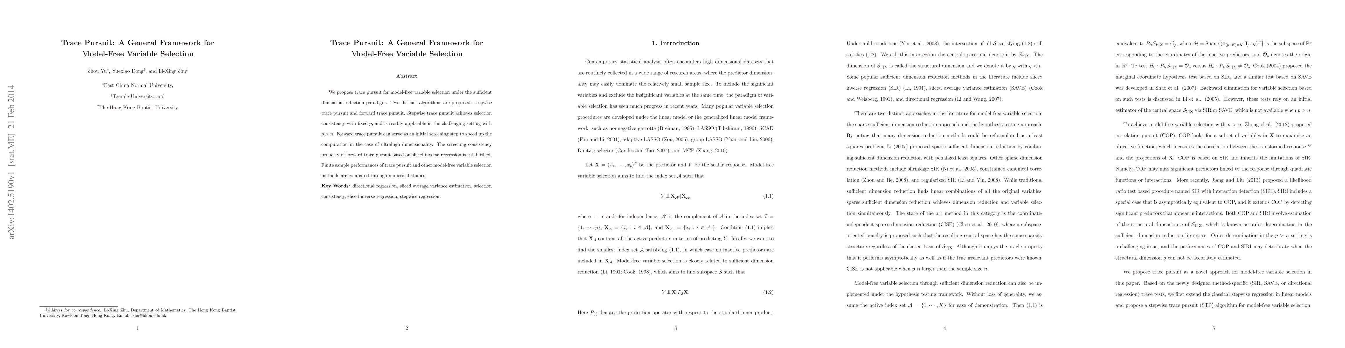This paper introduces trace pursuit, a model-free variable selection framework under sufficient dimension reduction, proposing stepwise and forward trace pursuit algorithms. The stepwise method achieves selection consistency, while the forward method serves as an efficient initial screening for ultrahigh-dimensional data. Numerical studies compare trace pursuit's performance with other variable selection techniques.