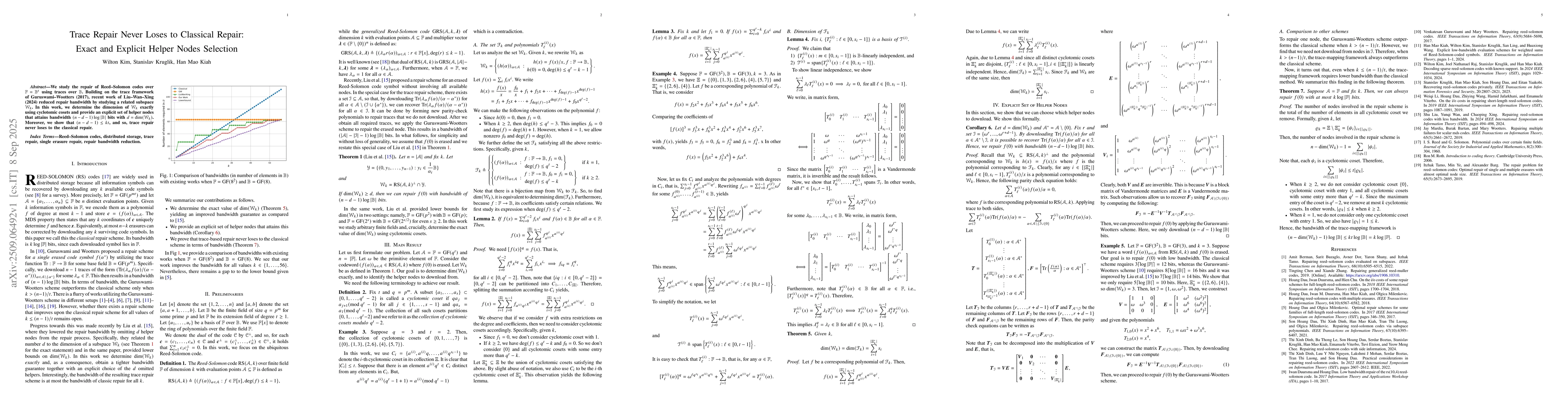 We study the repair of Reed--Solomon codes over $\mathbb{F}=\mathbb{B}^t$ using traces over $\mathbb{B}$. Building on the trace framework of Guruswami--Wootters (2017), recent work of Liu--Wan--Xing (2024) reduced repair bandwidth by studying a related subspace $\mathcal{W}_k$. In this work, we determine the dimension of $\mathcal{W}_k$ exactly using cyclotomic cosets and provide an explicit set of helper nodes that attains bandwidth $(n-d-1)\log |\mathbb{B}|$ bits with $d=\text{dim}(\mathcal{W}_k)$. Moreover, we show that $(n-d-1)\le kt$, and so, trace repair never loses to the classical repair.