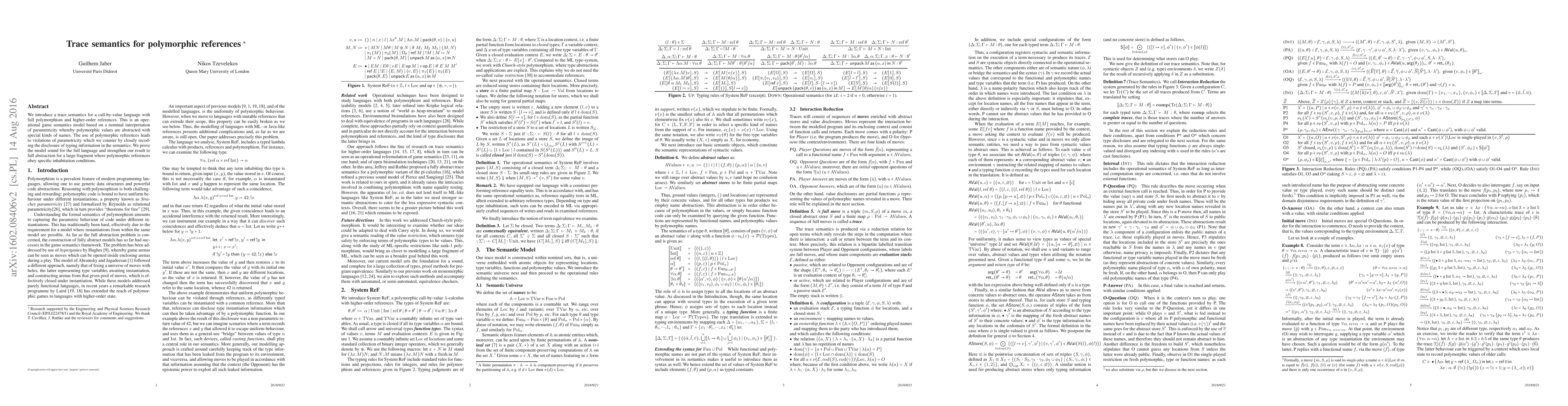This paper introduces a trace semantics for a polymorphic call-by-value language with higher-order references, addressing violations of parametricity through recoded typing information disclosure. The model is proven sound for the full language and achieves full abstraction for a fragment adhering to specific reference inhabitation conditions.