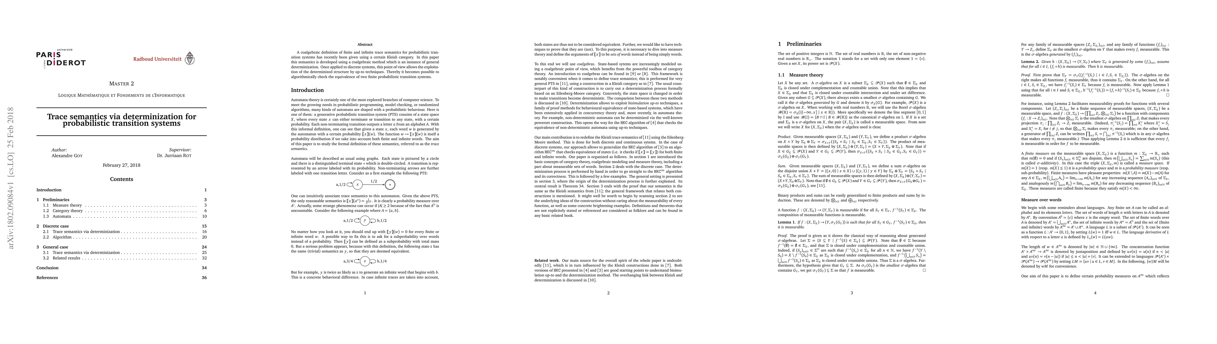 A coalgebraic definition of finite and infinite trace semantics for probabilistic transition systems has recently been given using a certain Kleisli category. In this paper this semantics is developed using a coalgebraic method which is an instance of general determinization. Once applied to discrete systems, this point of view allows the exploitation of the determinized structure by up-to techniques. Thereby it becomes possible to algorithmically check the equivalence of two finite probabilistic transition systems.