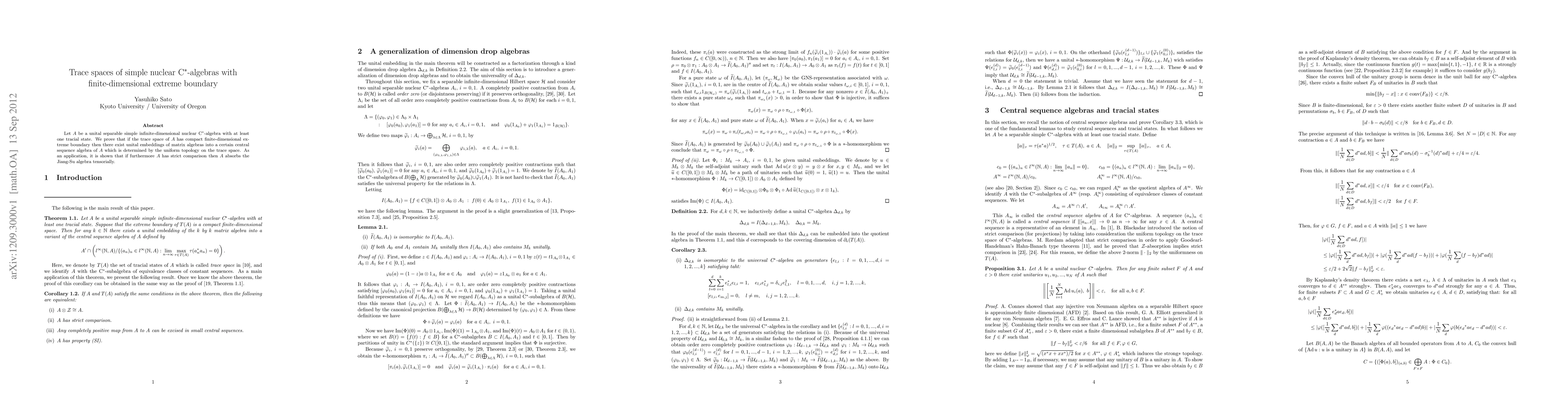 Let A be a unital separable simple infinite-dimensional nuclear C*-algebra with at least one tracial state. We prove that if the trace space of A has compact finite-dimensional extreme boundary then there exist unital embeddings of matrix algebras into a certain central sequence algebra of A which is determined by the uniform topology on the trace space. As an application, it is shown that if furthermore A has strict comparison then A absorbs the Jiang-Su algebra tensorially.