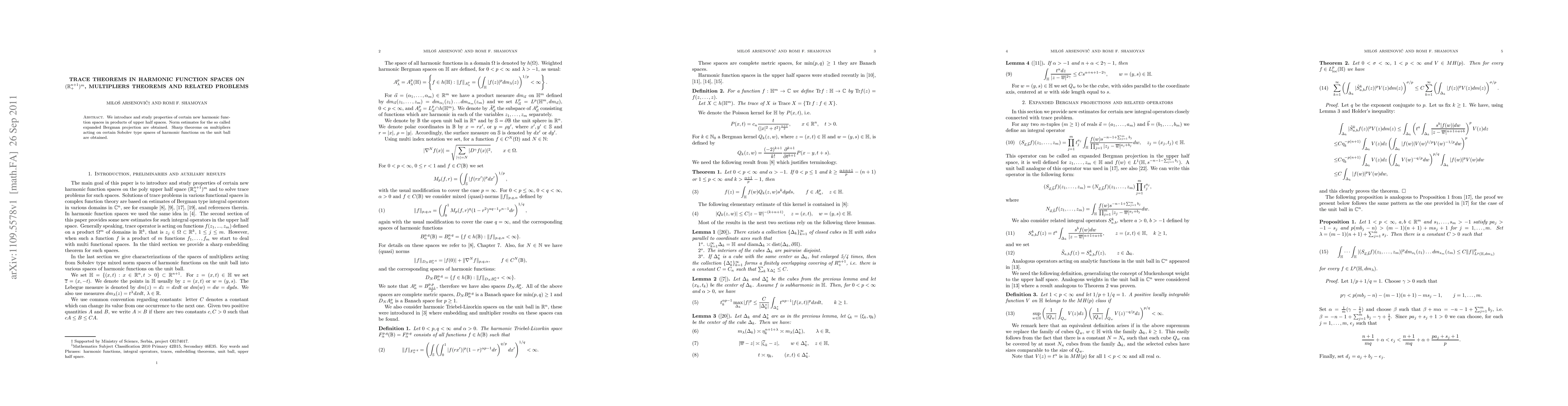 Two-line summary: This paper introduces new harmonic function spaces on products of upper half-spaces and establishes norm estimates for expanded Bergman projections. It also presents sharp multiplier theorems for Sobolev type spaces of harmonic functions on the unit ball, contributing to the understanding of these function spaces.