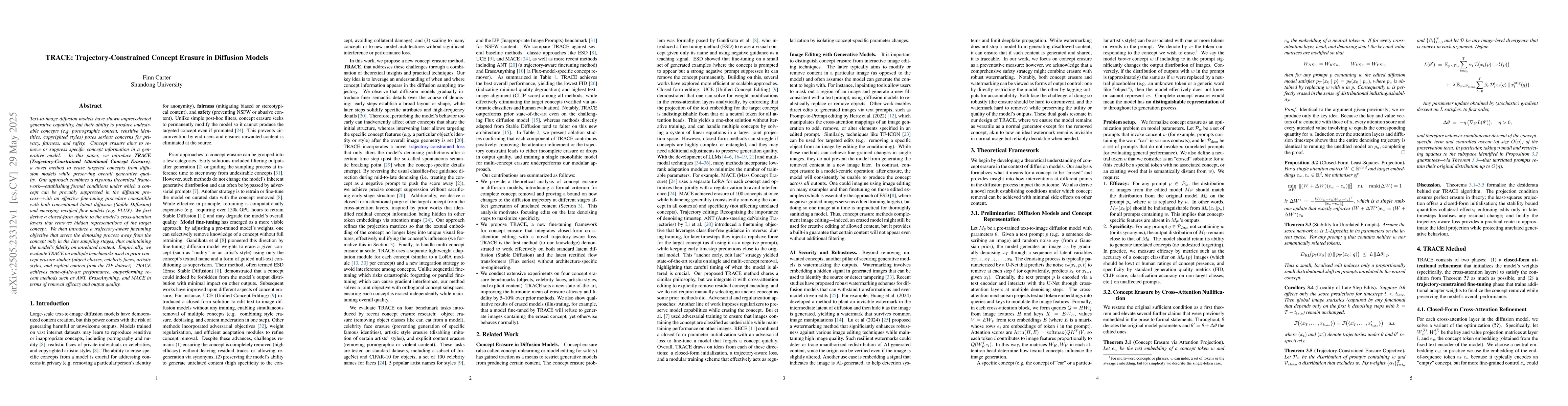 The research introduces TRACE, a method for concept erasure in diffusion models by combining theoretical guarantees with practical performance. TRACE focuses on later denoising stages and uses a trajectory-aware loss to minimize collateral damage to unrelated features.