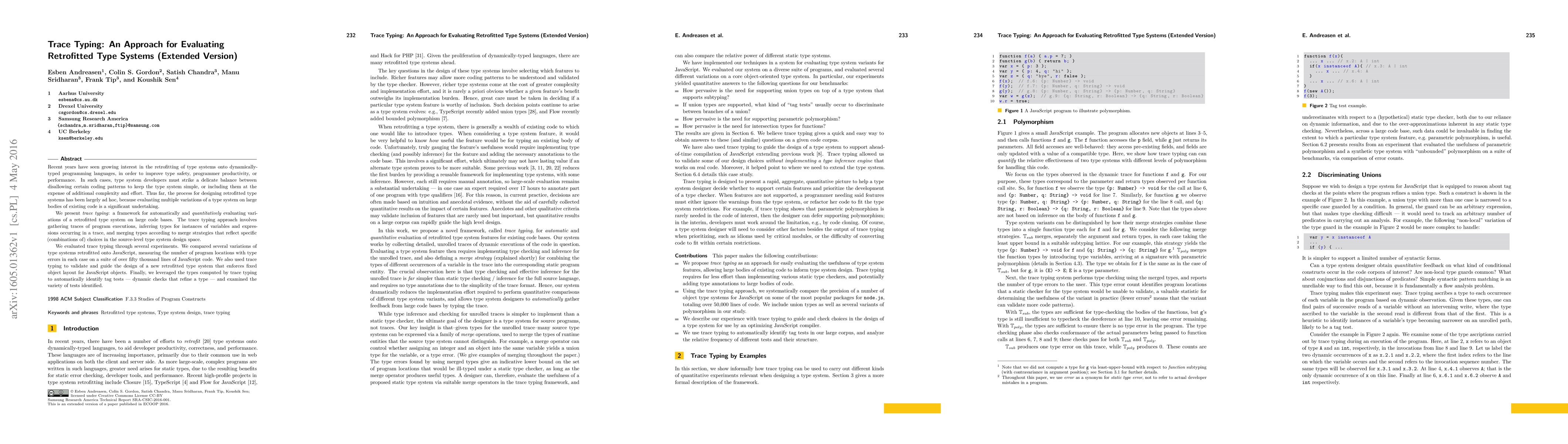 Recent years have seen growing interest in the retrofitting of type systems onto dynamically-typed programming languages, in order to improve type safety, programmer productivity, or performance. In such cases, type system developers must strike a delicate balance between disallowing certain coding patterns to keep the type system simple, or including them at the expense of additional complexity and effort. Thus far, the process for designing retrofitted type systems has been largely ad hoc, because evaluating multiple variations of a type system on large bodies of existing code is a significant undertaking. We present trace typing: a framework for automatically and quantitatively evaluating variations of a retrofitted type system on large code bases. The trace typing approach involves gathering traces of program executions, inferring types for instances of variables and expressions occurring in a trace, and merging types according to merge strategies that reflect specific (combinations of) choices in the source-level type system design space. We evaluated trace typing through several experiments. We compared several variations of type systems retrofitted onto JavaScript, measuring the number of program locations with type errors in each case on a suite of over fifty thousand lines of JavaScript code. We also used trace typing to validate and guide the design of a new retrofitted type system that enforces fixed object layout for JavaScript objects. Finally, we leveraged the types computed by trace typing to automatically identify tag tests --- dynamic checks that refine a type --- and examined the variety of tests identified.