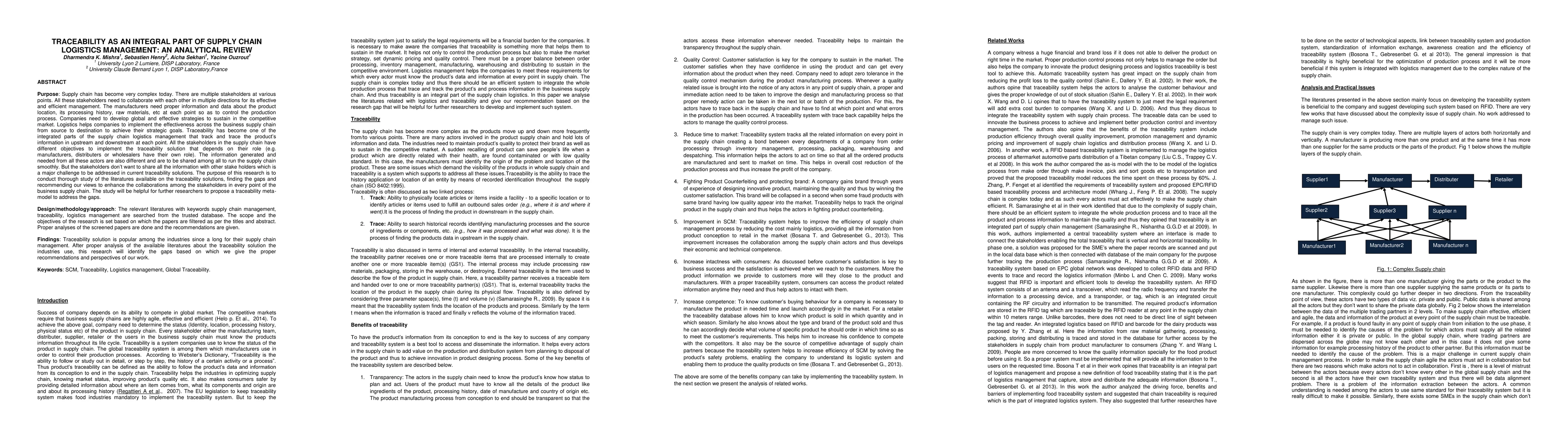 This paper conducts an analytical review of traceability in supply chain logistics management, identifying gaps in current solutions and recommending strategies to enhance stakeholder collaboration. The study analyzes existing literature to propose a meta-model for improved traceability across the supply chain.