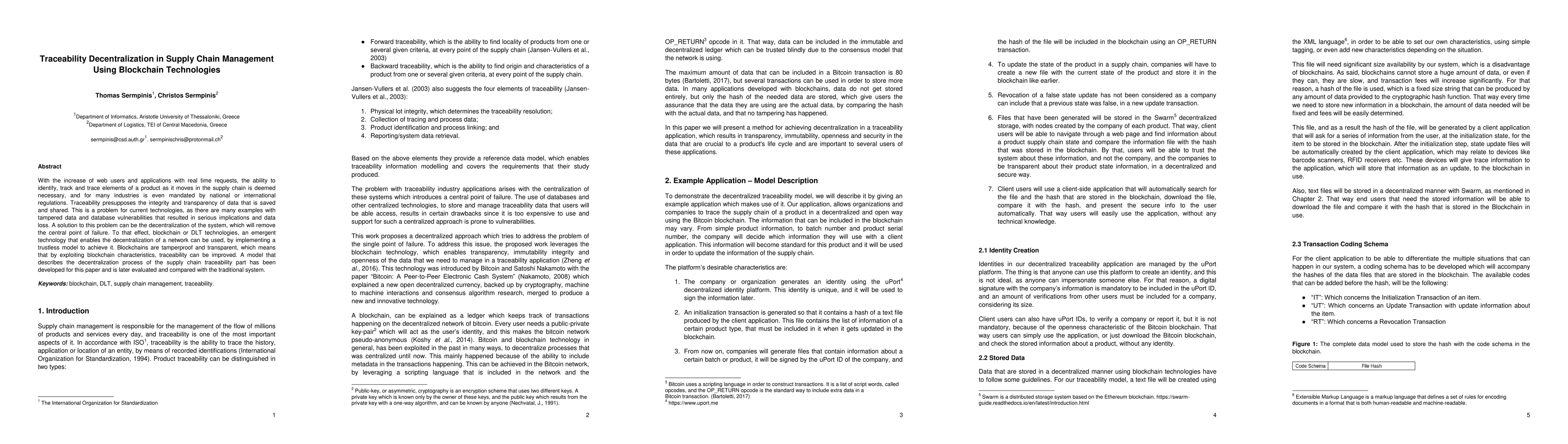 With the increase of web users and applications with real time requests, the ability to identify, track and trace elements of a product as it moves in the supply chain is deemed necessary, and for many industries is even mandated by national or international regulations. Traceability presupposes the integrity and transparency of data that is saved and shared. This is a problem for current technologies, as there are many examples with tampered data and database vulnerabilities that resulted in serious implications and data loss. A solution to this problem can be the decentralization of the system, which will remove the central point of failure. To that effect, blockchain or DLT technologies, an emergent technology that enables the decentralization of a network can be used, by implementing a trustless model to achieve it. Blockchains are tamperproof and transparent, which means that by exploiting blockchain characteristics, traceability can be improved. A model that describes the decentralization process of the supply chain traceability part has been developed for this paper and is later evaluated and compared with the traditional system.