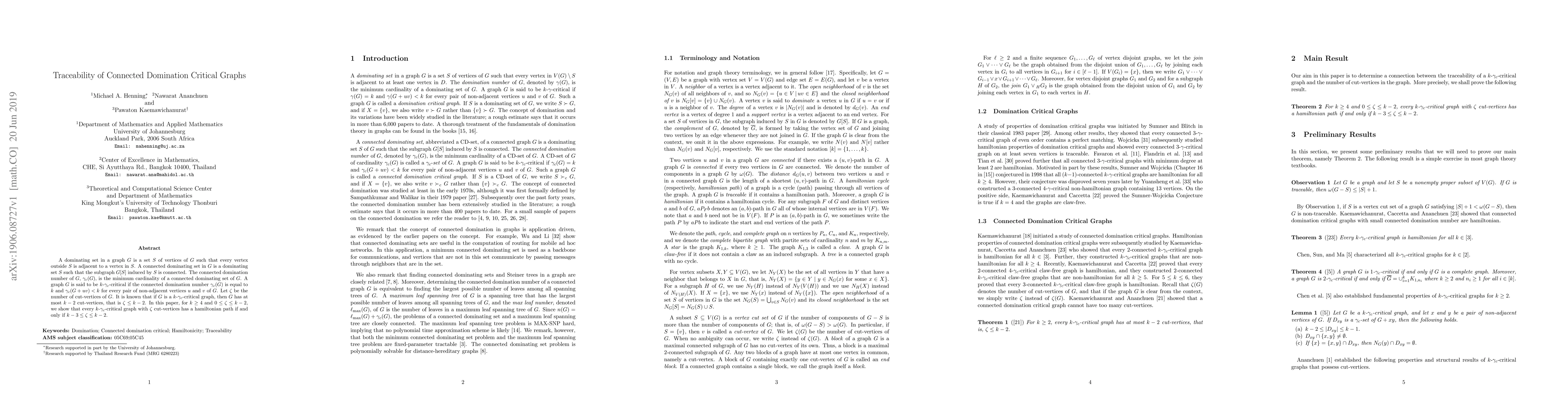 A dominating set in a graph $G$ is a set $S$ of vertices of $G$ such that every vertex outside $S$ is adjacent to a vertex in $S$. A connected dominating set in $G$ is a dominating set $S$ such that the subgraph $G[S]$ induced by $S$ is connected. The connected domination number of $G$, $\gamma_c(G)$, is the minimum cardinality of a connected dominating set of $G$. A graph $G$ is said to be $k$-$\gamma_{c}$-critical if the connected domination number $\gamma_{c}(G)$ is equal to $k$ and $\gamma_{c}(G + uv) < k$ for every pair of non-adjacent vertices $u$ and $v$ of $G$. Let $\zeta$ be the number of cut-vertices of $G$. It is known that if $G$ is a $k$-$\gamma_{c}$-critical graph, then $G$ has at most $k - 2$ cut-vertices, that is $\zeta \le k - 2$. In this paper, for $k \ge 4$ and $0 \le \zeta \le k - 2$, we show that every $k$-$\gamma_{c}$-critical graph with $\zeta$ cut-vertices has a hamiltonian path if and only if $k - 3 \le \zeta \le k - 2$.