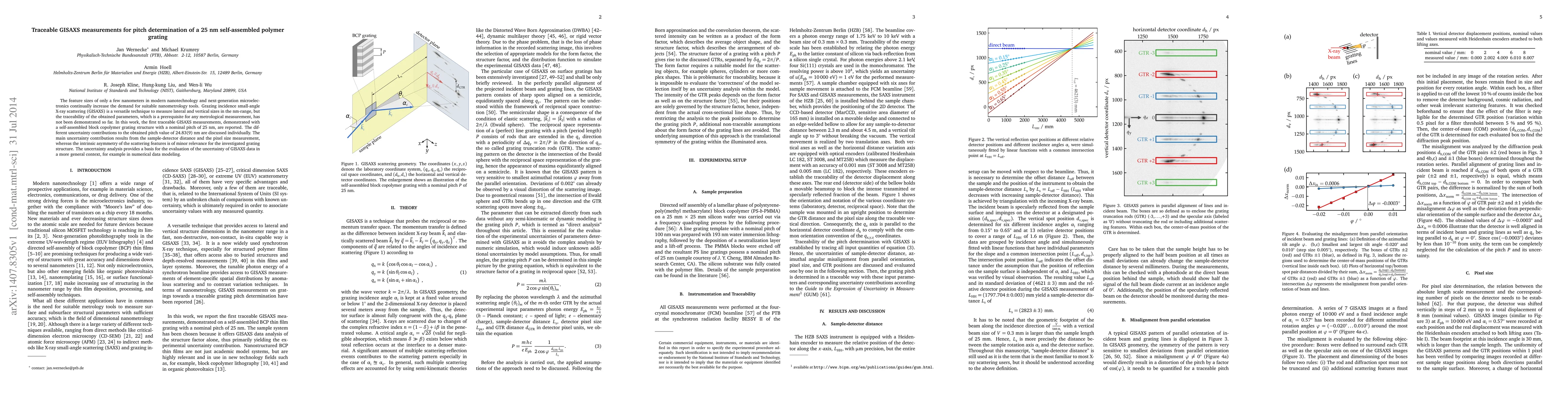 This paper reports the first traceable GISAXS measurements for determining the pitch of a 25 nm self-assembled polymer grating, demonstrating the technique's metrological potential. The main uncertainty arises from sample-detector distance and pixel size, while intrinsic asymmetry has minor impact.