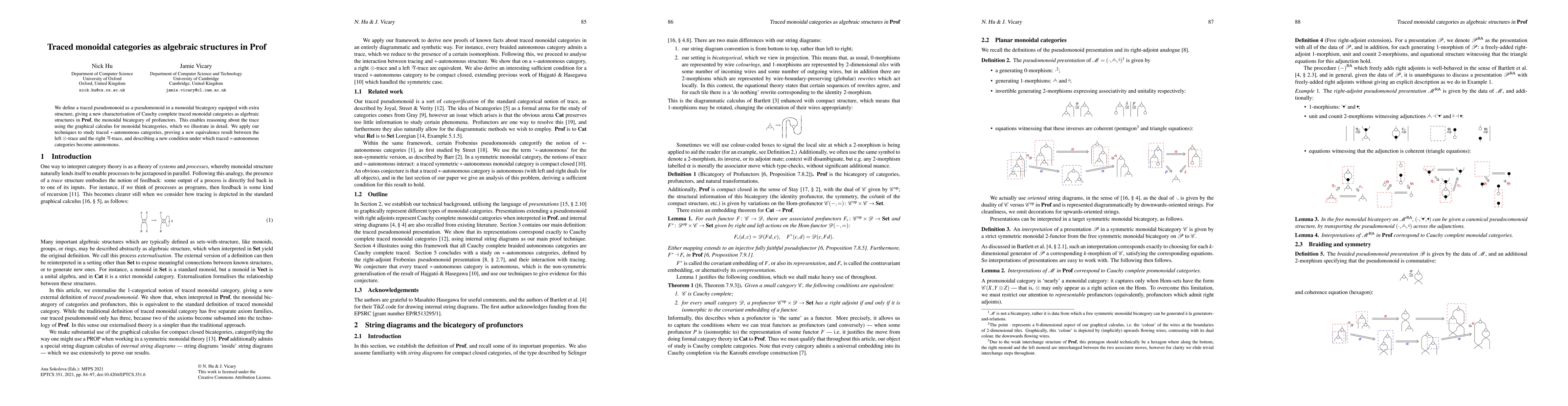 This paper defines traced pseudomonoids in monoidal bicategories and characterizes Cauchy complete traced monoidal categories as algebraic structures in Prof. It employs graphical calculus for reasoning about traces and applies these techniques to demonstrate an equivalence between left and right traces in traced ∗-autonomous categories.