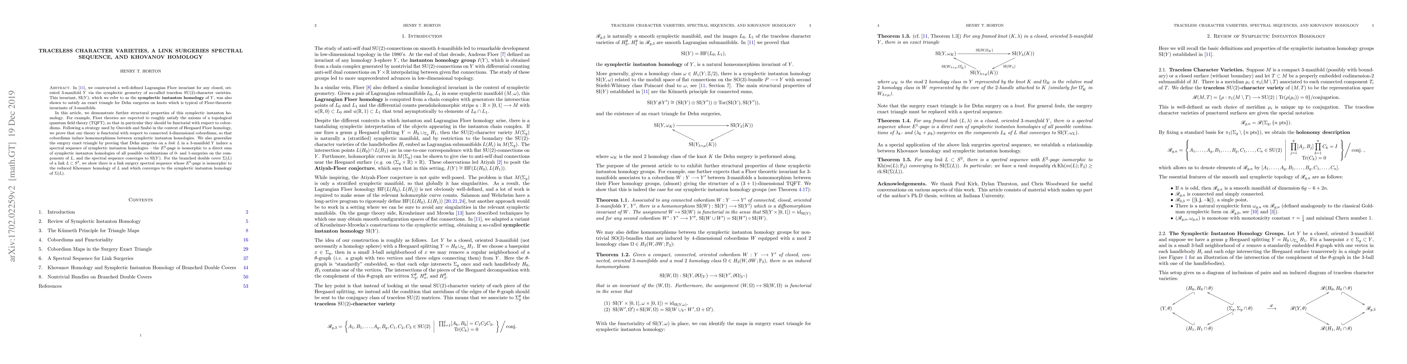 This paper extends the construction of symplectic instanton homology for closed, oriented 3-manifolds via traceless SU(2)-character varieties, proving its functoriality with respect to 4-dimensional cobordisms and linking it to a spectral sequence for link surgeries. It also connects this homology to Khovanov homology through a spectral sequence converging to the instanton homology of the branched double cover of a link.