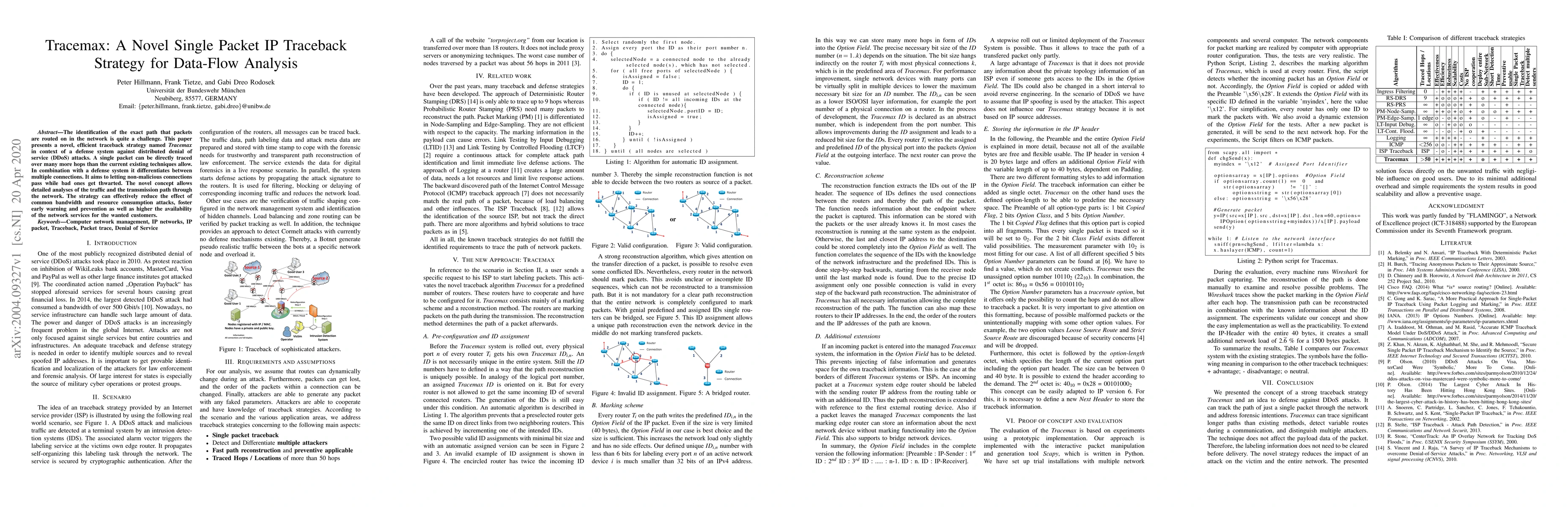 The paper introduces Tracemax, a novel single packet IP traceback strategy for identifying packet routing paths in networks, aiming to enhance defense against DDoS attacks by differentiating between malicious and non-malicious connections. This method allows for detailed traffic analysis and reduces the impact of bandwidth and resource consumption attacks.