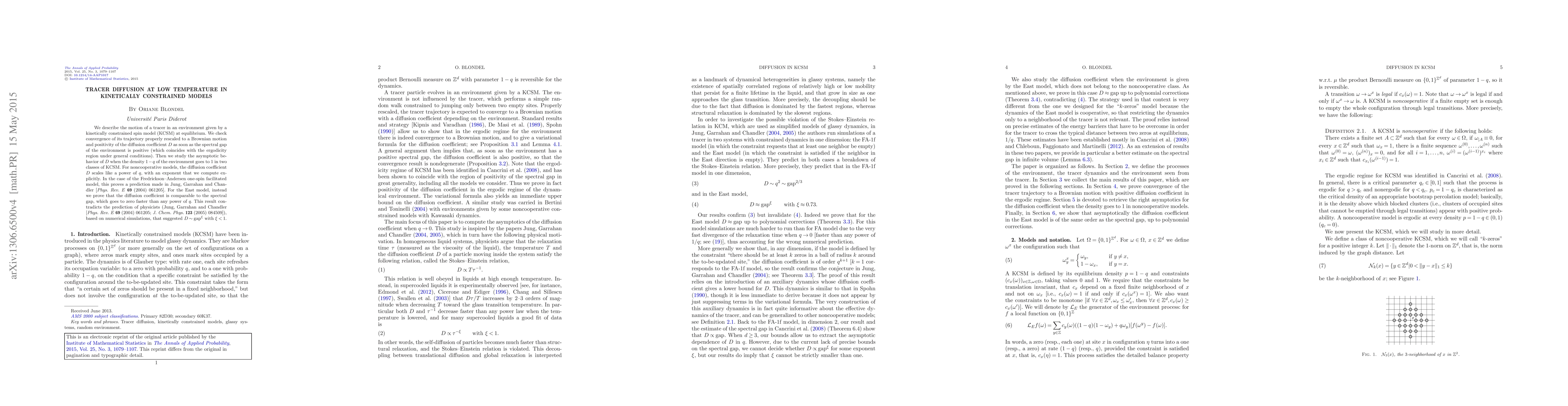 This paper explores the diffusion of a tracer in kinetically constrained spin models at low temperatures, confirming the convergence of its rescaled trajectory to Brownian motion and the positivity of the diffusion coefficient $D$. It reveals differing scaling behaviors for $D$ in noncooperative models and the Fredrickson-Andersen model, while disproving previous predictions for the East model.