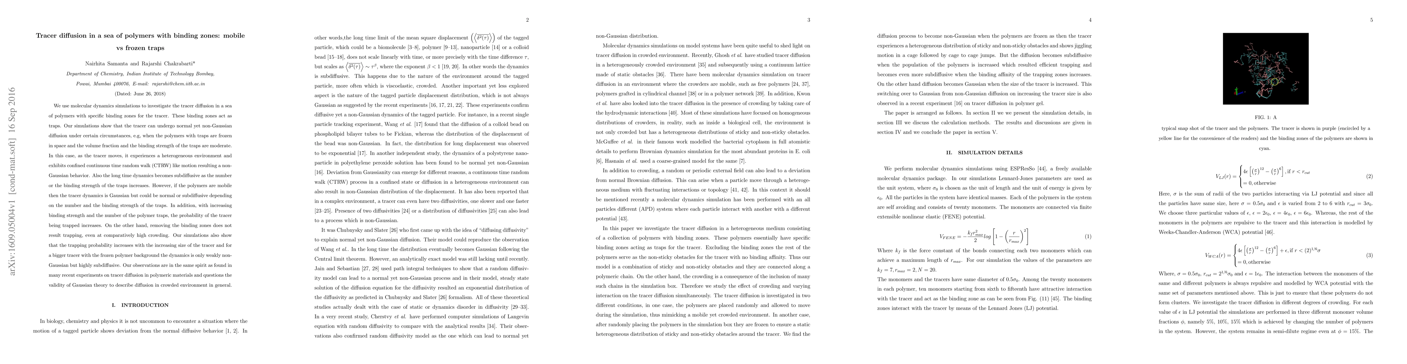This paper uses molecular dynamics simulations to study tracer diffusion in a polymer matrix with binding zones acting as traps. It finds that tracer diffusion can be non-Gaussian when polymers are frozen, leading to subdiffusive behavior, while mobile polymers result in Gaussian diffusion, questioning the validity of Gaussian diffusion theory in crowded environments.