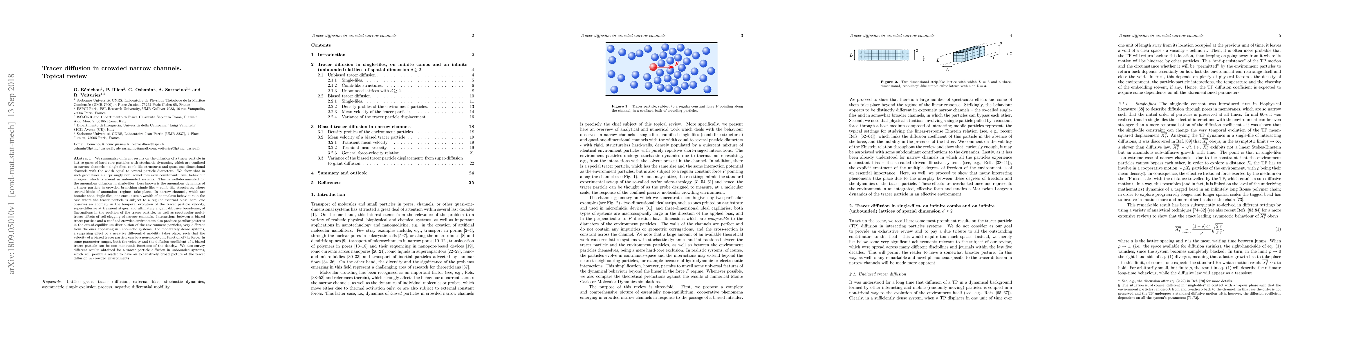 We summarise different results on the diffusion of a tracer particle in lattice gases of hard-core particles with stochastic dynamics, which are confined to narrow channels -- single-files, comb-like structures and quasi-one-dimensional channels with the width equal to several particle diameters. We show that in such geometries a surprisingly rich, sometimes even counter-intuitive, behaviour emerges, which is absent in unbounded systems. We also present a survey of different results obtained for a tracer particle diffusion in unbounded systems, which will permit a reader to have an exhaustively broad picture of the tracer diffusion in crowded environments.