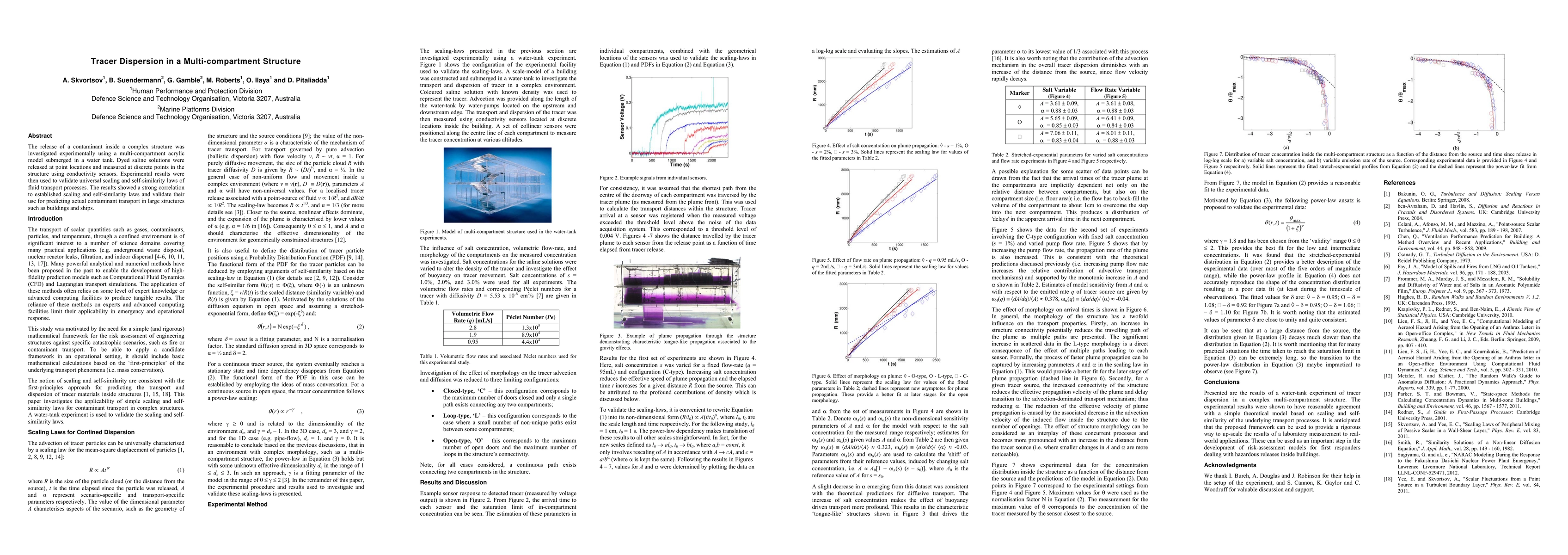 An experimental study of the tracer dispersion in a complex structure is presented. A point source of tracer (dyed salt) was placed inside a multi-compartment structure embedded in water tank. This experimental setting corresponds to a hazardous tracer release inside the engineering structure (building, ship, aircarft etc). A system of conductivity sensors was deployed to monitor the propagation of a tracer plume in the structure, including tracer trapping inside some compartments and its release to the outside environment through the external openings. The experimental data is processed by employing the ideas of scaling and self-similarity of underlying transport processes. The established and validated scaling laws provide a rigorous way to up-scale the results of laboratory modeling to real operational scenarios and can be used as an important step in the development of risk-assessment models for the first responders to hazardous releases. Keywords: hazardous plume, tracer dispersion, diffusion and advection, confined environment, water tank, structure