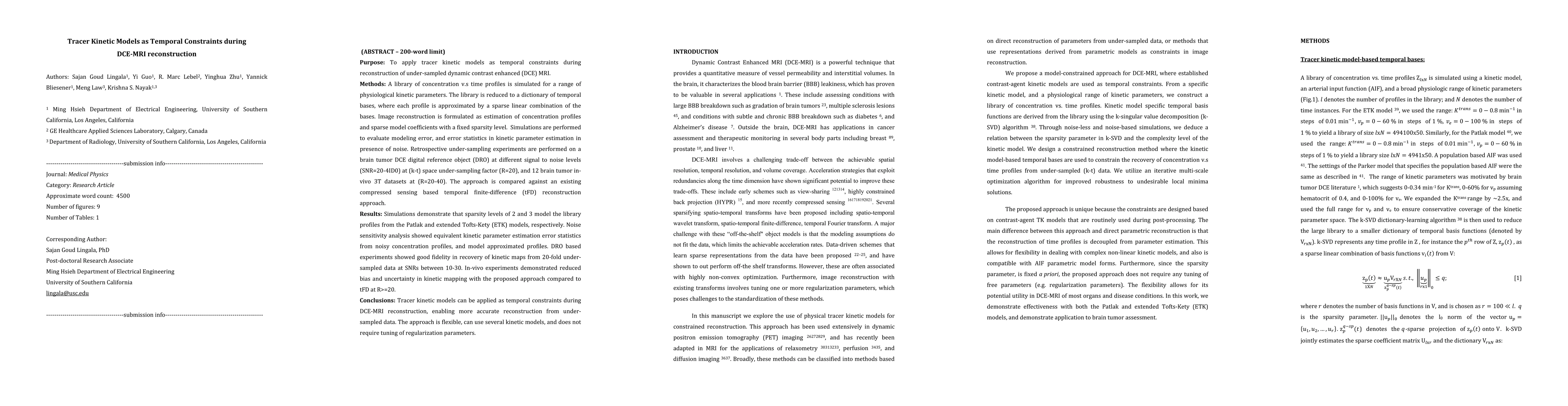This paper proposes using tracer kinetic models as temporal constraints to reconstruct under-sampled dynamic contrast-enhanced (DCE) MRI data, demonstrating improved accuracy and reduced bias compared to existing methods. The method shows good performance in both simulated and in-vivo brain tumor datasets.