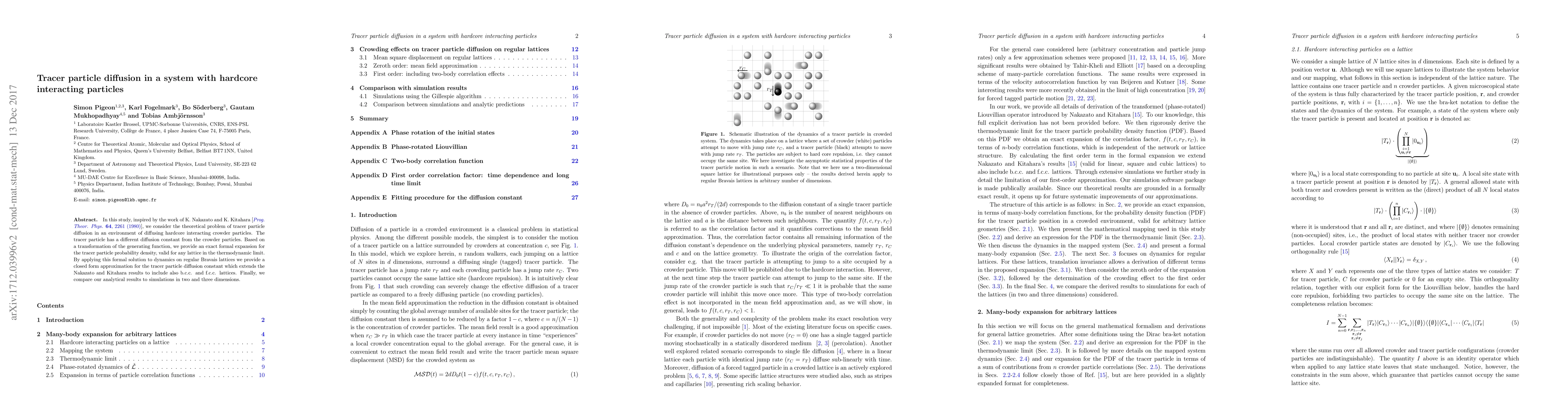 The paper presents a detailed derivation of the probability density function (PDF) for tracer particle diffusion in a crowded system, extending previous results to additional lattice types.