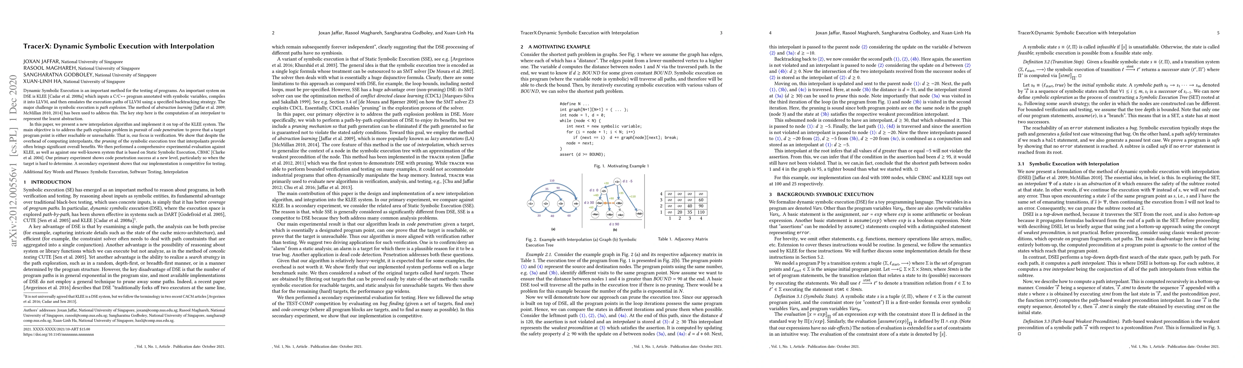 This paper introduces TracerX, a new dynamic symbolic execution system that uses interpolation to address path explosion, achieving higher code penetration success rates than existing systems like KLEE and CBMC.
