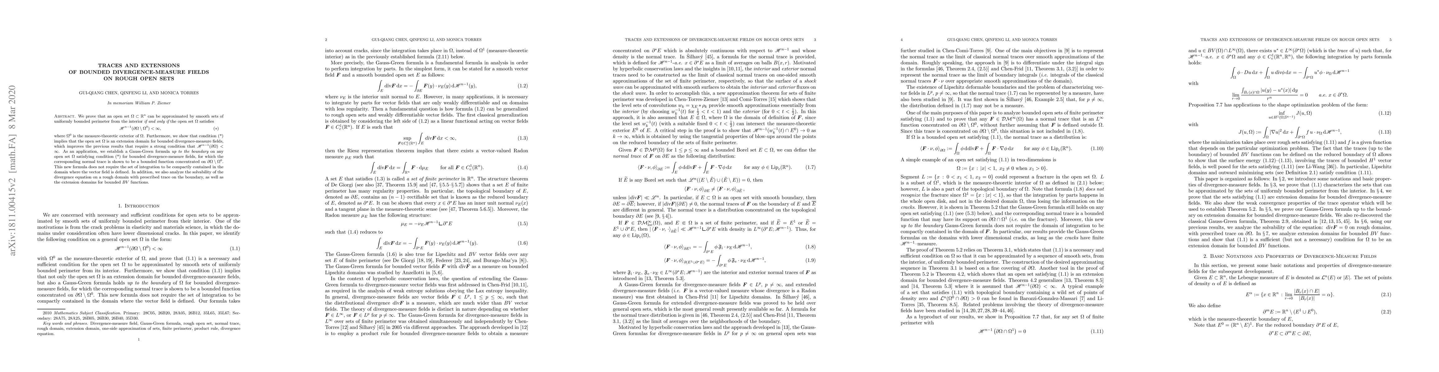 This paper proves that an open set in $\mathbb{R}^n$ can be approximated by smooth sets if it satisfies a finite perimeter condition on its boundary, and shows that this condition allows for extensions of bounded divergence-measure fields. It also establishes a Gauss-Green formula for such fields and analyzes the solvability of the divergence equation on rough domains.