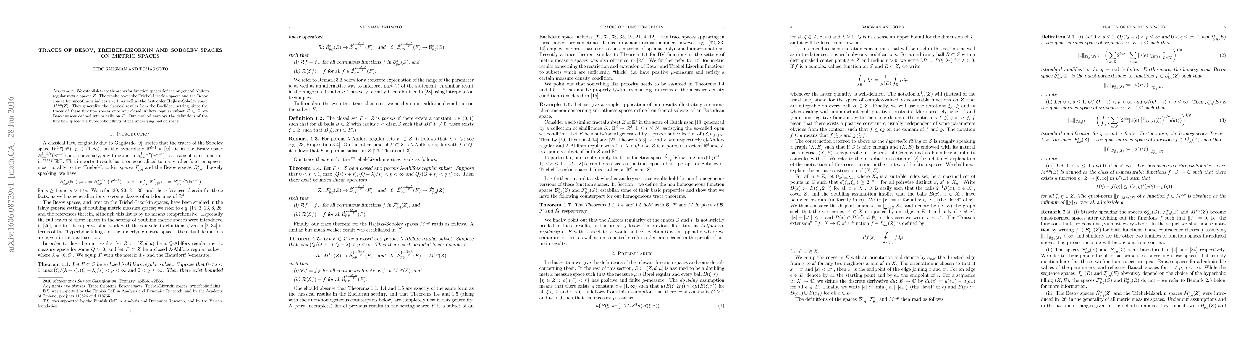 This paper establishes trace theorems for Besov, Triebel-Lizorkin, and Sobolev spaces on general Ahlfors regular metric spaces. The results generalize classical Euclidean theorems by showing that traces of these spaces onto closed subsets are Besov spaces defined intrinsically on those subsets, employing hyperbolic fillings for definitions.