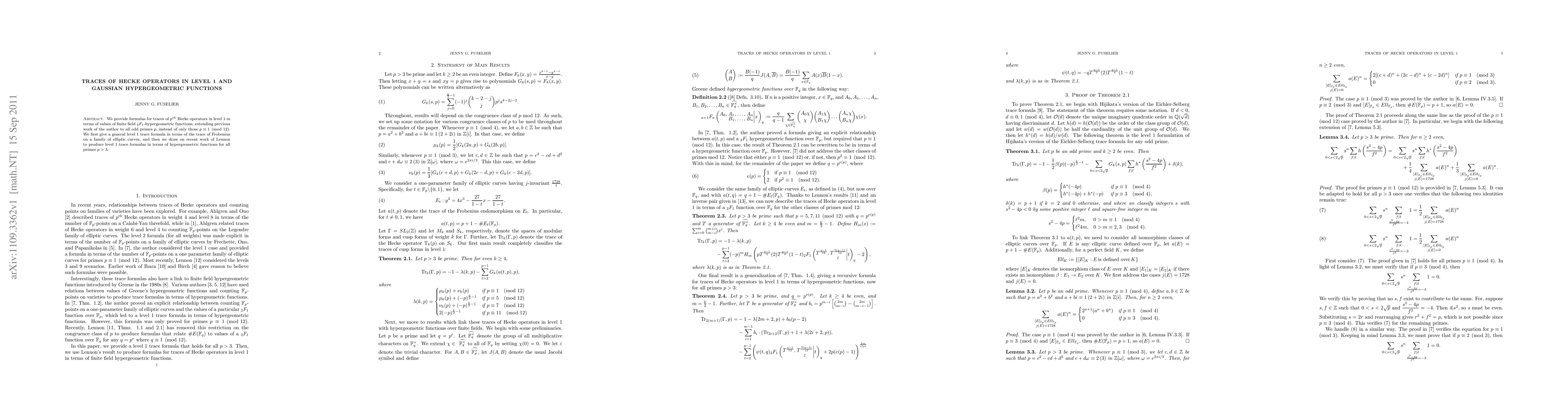 We provide formulas for traces of p-th Hecke operators in level 1 in terms of values of finite field 2F1-hypergeometric functions, extending previous work of the author to all odd primes p, instead of only those p=1 (mod 12). We first give a general level 1 trace formula in terms of the trace of Frobenius on a family of elliptic curves, and then we draw on recent work of Lennon to produce level 1 trace formulas in terms of hypergeometric functions for all primes p >3.