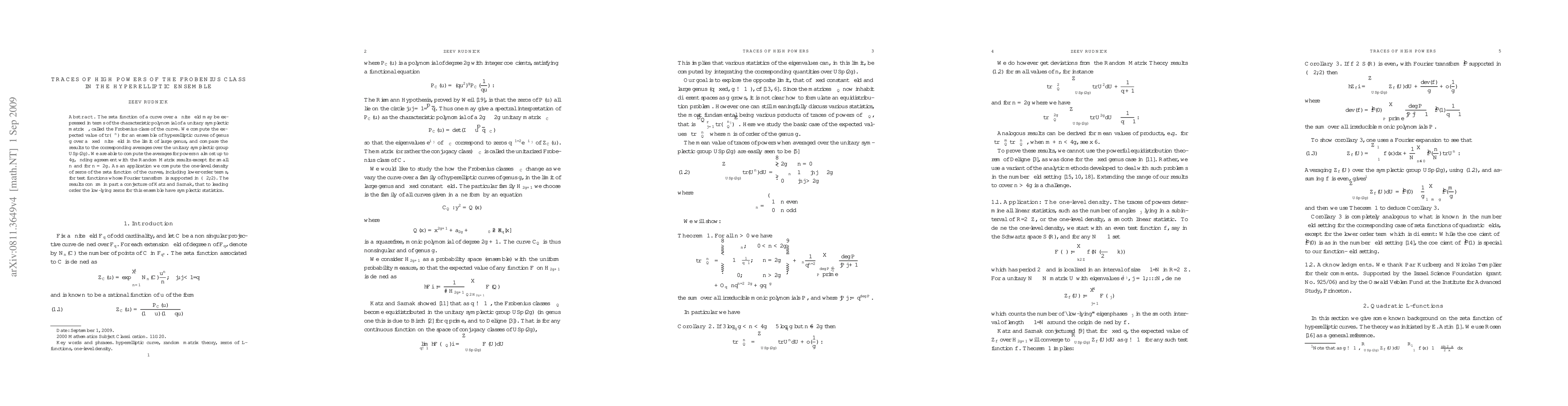 The zeta function of a curve over a finite field may be expressed in terms of the characteristic polynomial of a unitary symplectic matrix, called the Frobenius class of the curve. We compute the expected value of the trace of the n-th power of the Frobenius class for an ensemble of hyperelliptic curves of genus g over a fixed finite field in the limit of large genus, and compare the results to the corresponding averages over the unitary symplectic group USp(2g). We are able to compute the averages for powers n almost up to 4g, finding agreement with the Random Matrix results except for small n and for n=2g. As an application we compute the one-level density of zeros of the zeta function of the curves, including lower-order terms, for test functions whose Fourier transform is supported in (-2,2). The results confirm in part a conjecture of Katz and Sarnak, that to leading order the low-lying zeros for this ensemble have symplectic statistics.