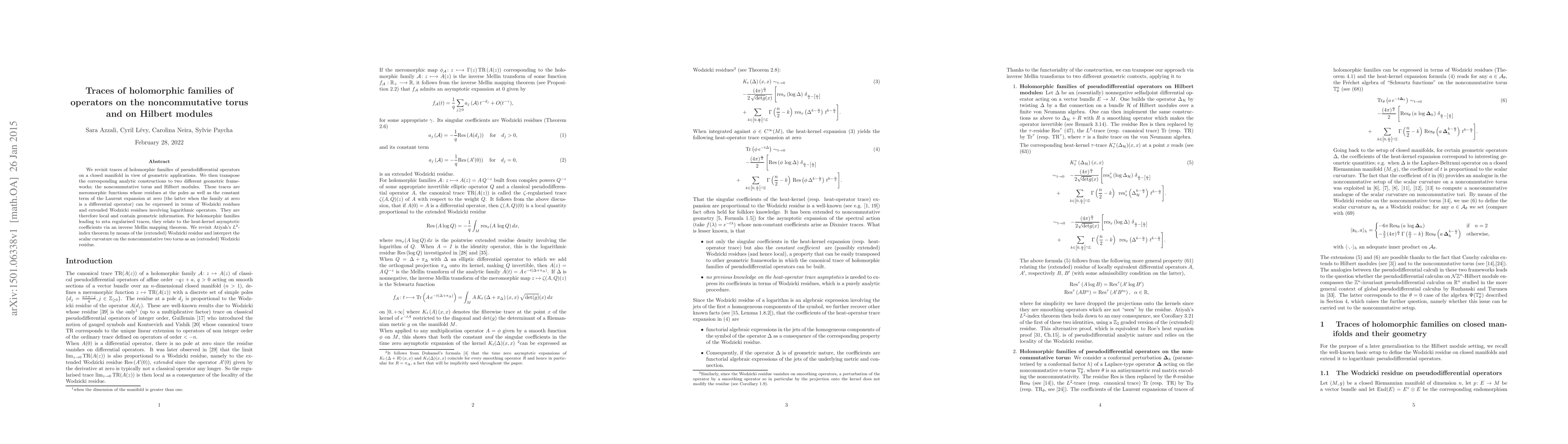 This paper examines traces of holomorphic families of pseudodifferential operators on the noncommutative torus and Hilbert modules, revealing meromorphic traces expressible via Wodzicki residues. It reinterprets Atiyah's L^2-index theorem and identifies scalar curvature on the noncommutative torus as an extended Wodzicki residue.