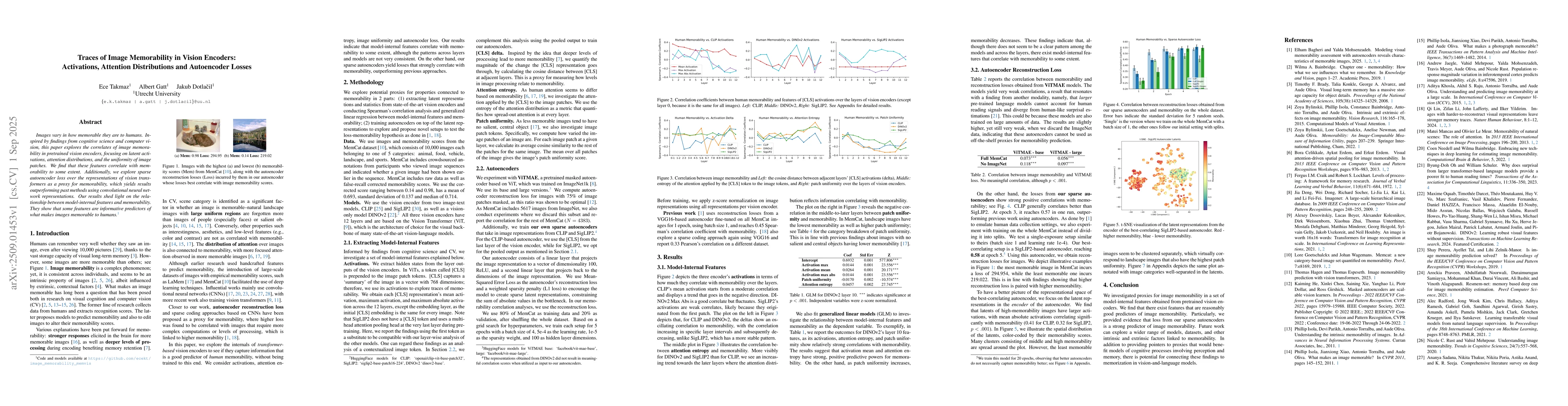 Images vary in how memorable they are to humans. Inspired by findings from cognitive science and computer vision, this paper explores the correlates of image memorability in pretrained vision encoders, focusing on latent activations, attention distributions, and the uniformity of image patches. We find that these features correlate with memorability to some extent. Additionally, we explore sparse autoencoder loss over the representations of vision transformers as a proxy for memorability, which yields results outperforming past methods using convolutional neural network representations. Our results shed light on the relationship between model-internal features and memorability. They show that some features are informative predictors of what makes images memorable to humans.