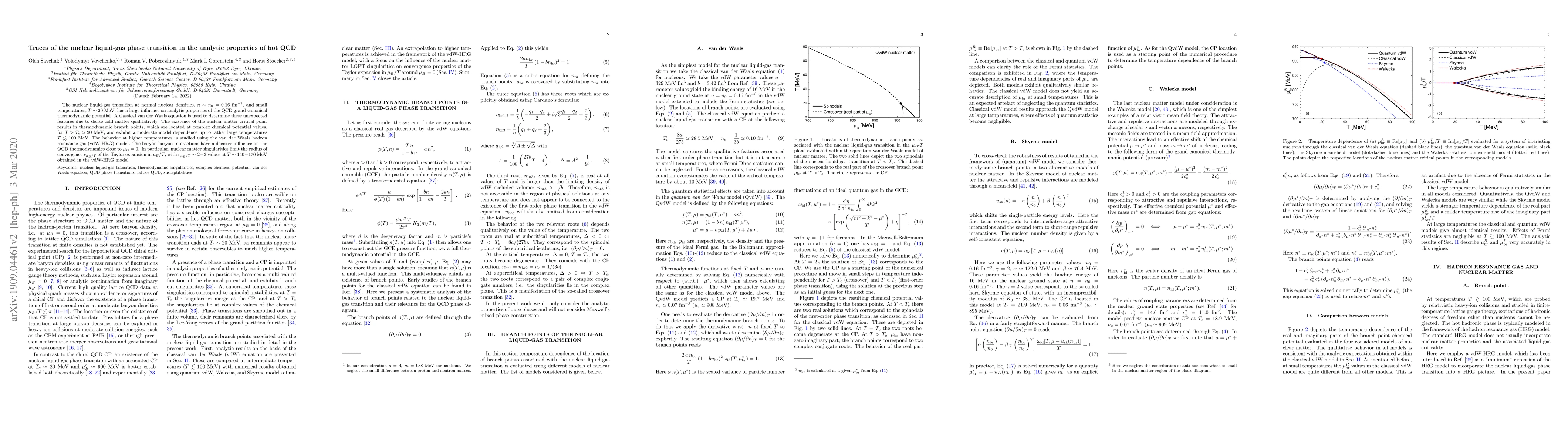 This paper investigates the nuclear liquid-gas phase transition's impact on the analytic properties of hot QCD, revealing thermodynamic branch points due to the critical point in nuclear matter. The van der Waals hadron resonance gas model shows that baryon-baryon interactions significantly influence QCD thermodynamics near zero baryon chemical potential.