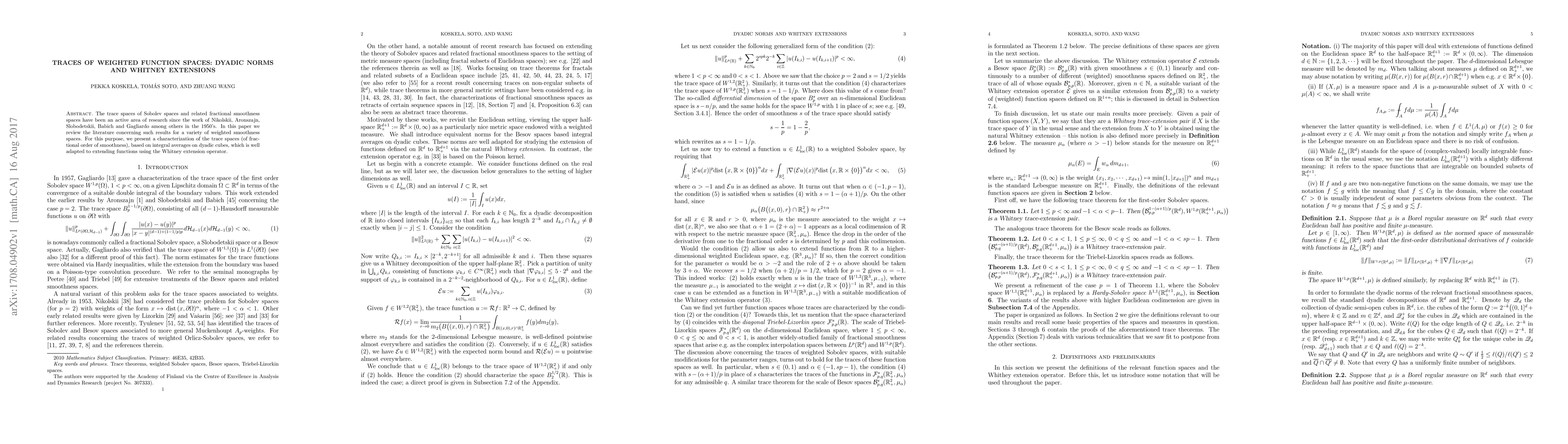 This paper reviews the literature on trace spaces of weighted function spaces, focusing on dyadic norms and Whitney extensions. It characterizes these trace spaces using integral averages on dyadic cubes, facilitating the extension of functions via the Whitney operator.