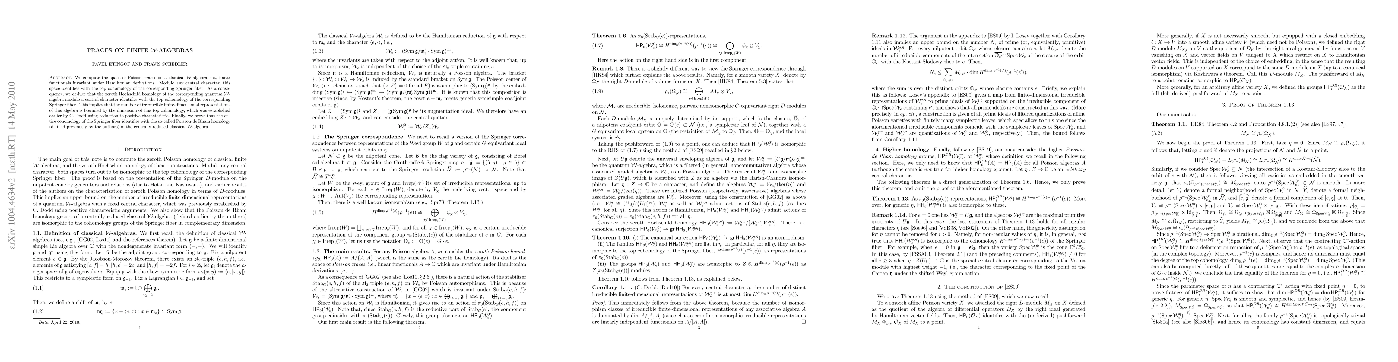 We compute the space of Poisson traces on a classical W-algebra modulo an arbitrary central character, i.e., linear functionals on such an algebra invariant under Hamiltonian derivations. This space identifies with the top cohomology of the corresponding Springer fiber. As a consequence, we deduce that the zeroth Hochschild homology of the corresponding quantum W-algebra modulo a central character identifies with the top cohomology of the corresponding Springer fiber. This implies that the number of irreducible finite-dimensional representations of this algebra is bounded by the dimension of this top cohomology, which was established earlier by C. Dodd using reduction to positive characteristic. Finally, we prove that the entire cohomology of the Springer fiber identifies with the so-called Poisson-de Rham homology (defined previously by the authors) of the classical W-algebra modulo a central character.