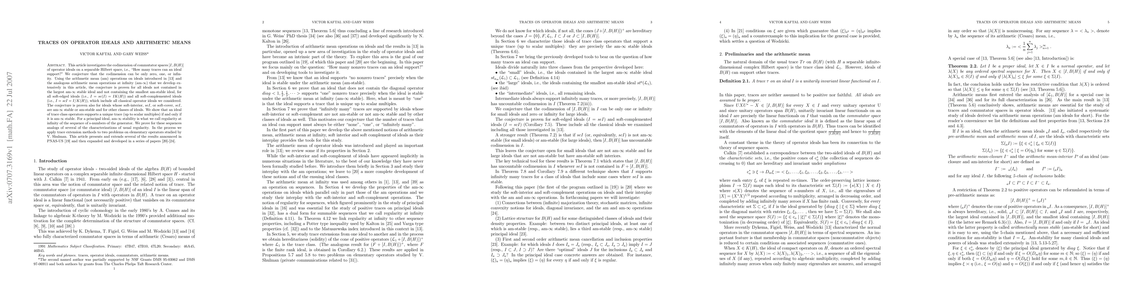 This article - a part of a multipaper project investigating arithmetic mean ideals - investigates the codimension of commutator spaces [I, B(H)] of operator ideals on a separable Hilbert space, i.e., ``How many traces can an ideal support?" We conjecture that the codimension can be only zero, one, or infinity. Using the arithmetic mean (am) operations on ideals introduced by Dykema, Figiel, Weiss, and Wodzicki, and the analogous am operations at infinity that we develop in this article, the conjecture is proven for all ideals not contained in the largest am-infinity stable ideal and not containing the smallest am-stable ideal. It is also proven for all soft-edged ideals (i.e., I= IK(H)) and all soft-complemented ideals (i.e., I= I/K(H)), which include many classical operator ideals. In the process, we prove that an ideal of trace class operators supports a unique trace (up to scalar multiples) if and only if it is am-infinity stable and that, for a principal ideal, am-infinity stability is equivalent to regularity at infinity of the sequence of s-numbers of the generator. Furthermore, we apply trace extension methods to two problems on elementary operators studied by V. Shulman and to Fuglede-Putnam type problems of the second author.