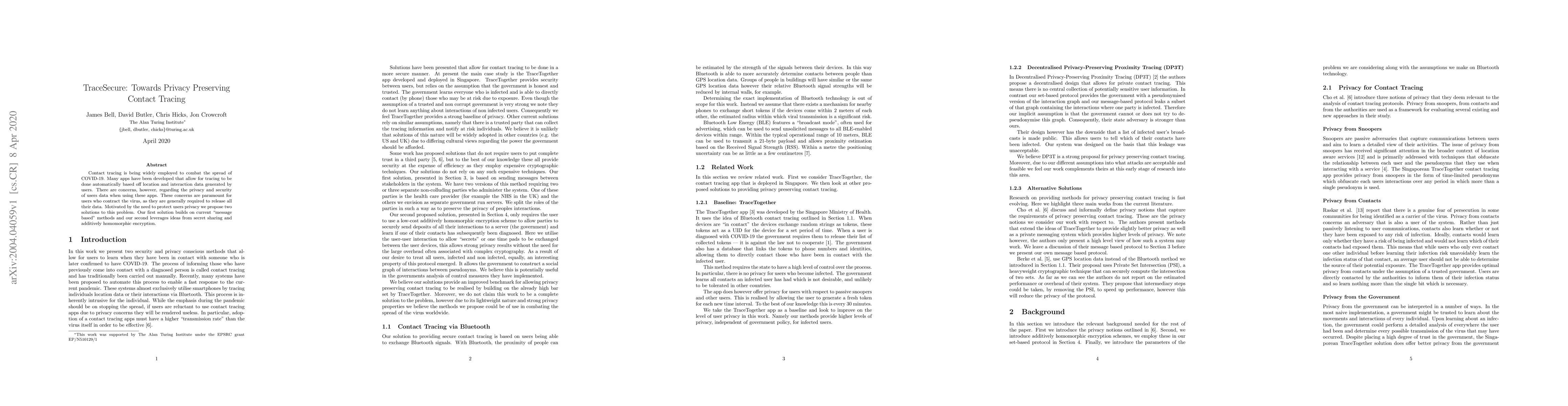 This paper proposes two solutions to protect user privacy in contact tracing apps, using message-based methods and secret sharing with additively homomorphic encryption.
