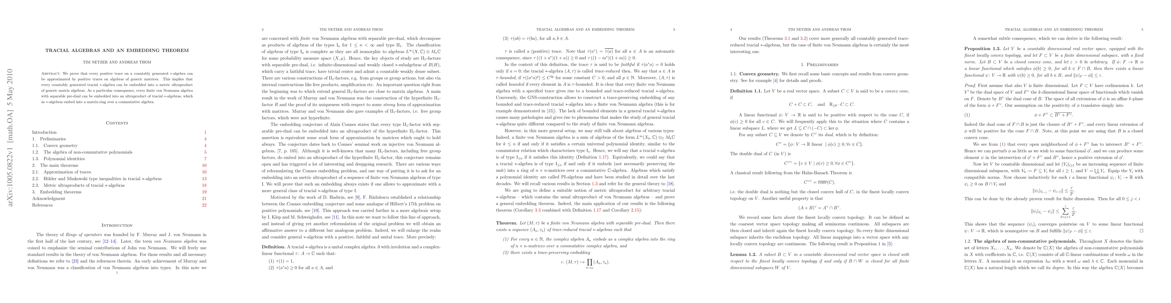 The paper establishes approximation theorems for traces on *-algebras and demonstrates embedding results for tracial *-algebras into ultraproducts, advancing the theory of non-commutative geometry and operator algebras.