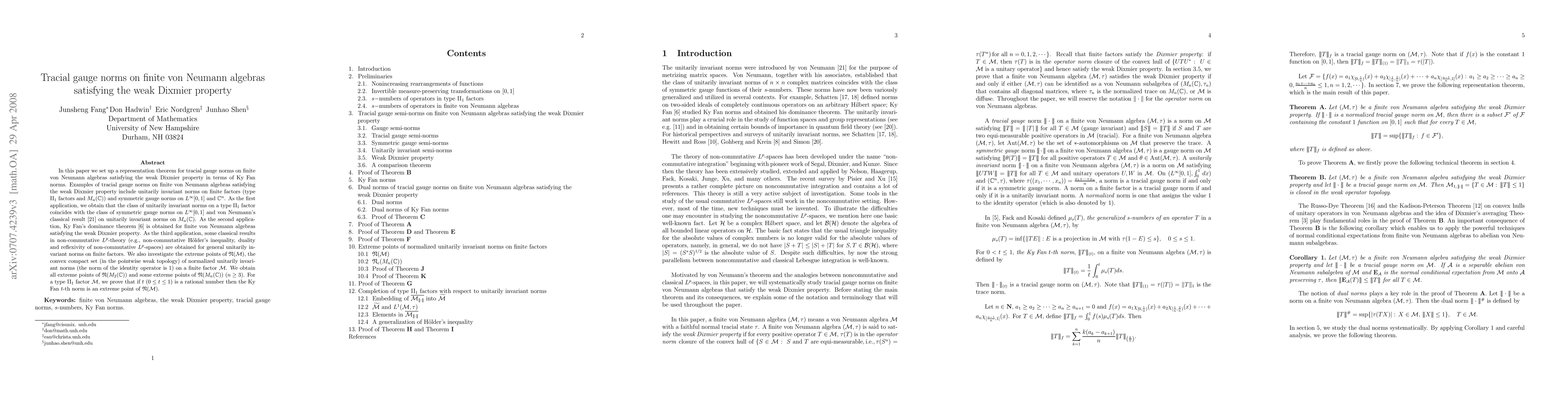 In this paper we set up a representation theorem for tracial gauge norms on finite von Neumann algebras satisfying the weak Dixmier property in terms of Ky Fan norms. Examples of tracial gauge norms on finite von Neumann algebras satisfying the weak Dixmier property include unitarily invariant norms on finite factors (type ${\rm II}\sb 1$ factors and $M_n(\cc)$) and symmetric gauge norms on $L^\infty[0,1]$ and $\cc^n$. As the first application, we obtain that the class of unitarily invariant norms on a type ${\rm II}\sb 1$ factor coincides with the class of symmetric gauge norms on $L^\infty[0,1]$ and von Neumann's classical result \cite{vN} on unitarily invariant norms on $M_n(\cc)$. As the second application, Ky Fan's dominance theorem \cite{Fan} is obtained for finite von Neumann algebras satisfying the weak Dixmier property. As the third application, some classical results in non-commutative $L^p$-theory (e.g., non-commutative H$\ddot{\text{o}}$lder's inequality, duality and reflexivity of non-commutative $L^p$-spaces) are obtained for general unitarily invariant norms on finite factors. We also investigate the extreme points of $\NN(\M)$, the convex compact set (in the pointwise weak topology) of normalized unitarily invariant norms (the norm of the identity operator is 1) on a finite factor $\M$. We obtain all extreme points of $\NN(M_2(\cc))$ and many extreme points of $\NN(M_n(\cc))$ ($n\geq 3$). For a type ${\rm II}\sb 1$ factor $\M$, we prove that if $t$ ($0\leq t\leq 1$) is a rational number then the Ky Fan $t$-th norm is an extreme point of $\NN(\M)$.