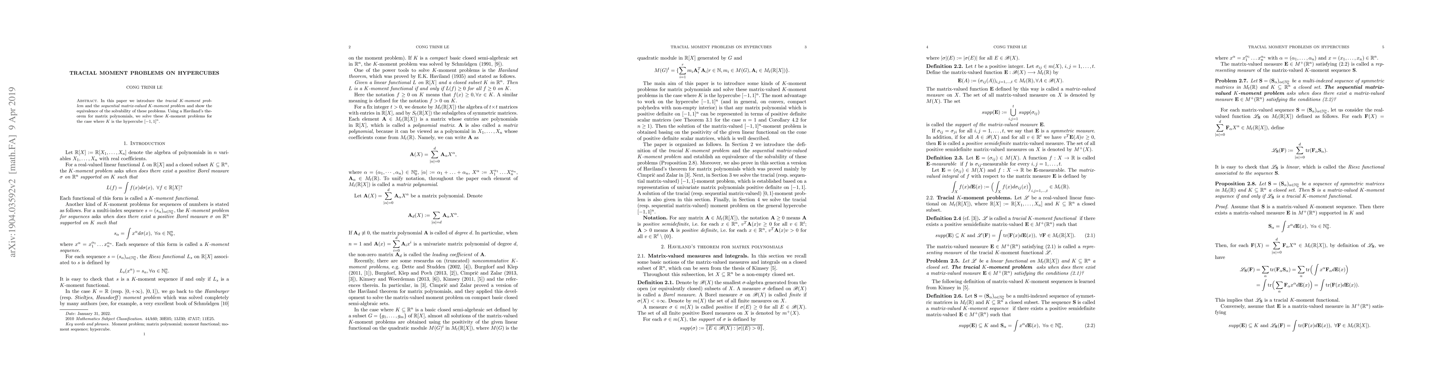 This paper introduces the tracial K-moment problem and the sequential matrix-valued K-moment problem, proving their equivalence. Using Haviland's theorem for matrix polynomials, the authors solve these K-moment problems for the hypercube [-1,1]^n.