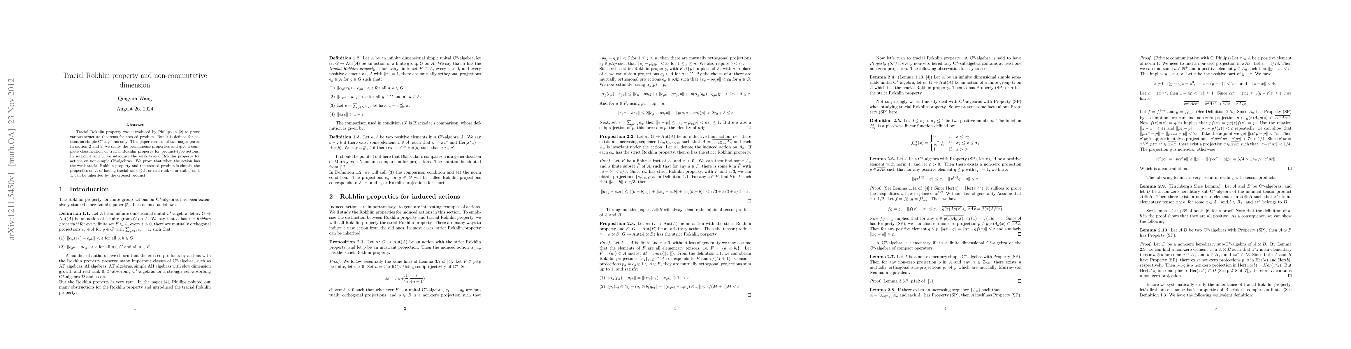 This paper classifies the tracial Rokhlin property for product-type actions on simple C*-algebras and introduces the weak tracial Rokhlin property for actions on non-simple C*-algebras, proving that certain non-commutative dimension properties can be inherited from the original algebra to the crossed product when the action possesses the weak tracial Rokhlin property.