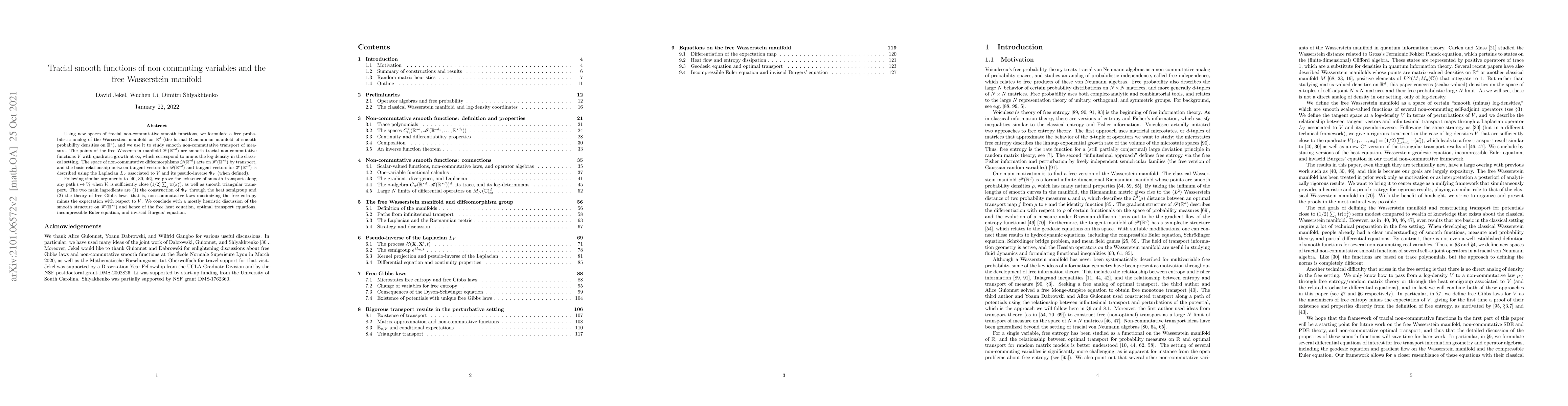 We formulate a free probabilistic analog of the Wasserstein manifold on $\mathbb{R}^d$ (the formal Riemannian manifold of smooth probability densities on $\mathbb{R}^d$), and we use it to study smooth non-commutative transport of measure. The points of the free Wasserstein manifold $\mathscr{W}(\mathbb{R}^{*d})$ are smooth tracial non-commutative functions $V$ with quadratic growth at $\infty$, which correspond to minus the log-density in the classical setting. The space of smooth tracial non-commutative functions used here is a new one whose definition and basic properties we develop in the paper; they are scalar-valued functions of self-adjoint $d$-tuples from arbitrary tracial von Neumann algebras that can be approximated by trace polynomials. The space of non-commutative diffeomorphisms $\mathscr{D}(\mathbb{R}^{*d})$ acts on $\mathscr{W}(\mathbb{R}^{*d})$ by transport, and the basic relationship between tangent vectors for $\mathscr{D}(\mathbb{R}^{*d})$ and tangent vectors for $\mathscr{W}(\mathbb{R}^{*d})$ is described using the Laplacian $L_V$ associated to $V$ and its pseudo-inverse $\Psi_V$ (when defined). Following similar arguments to arXiv:1204.2182, arXiv:1701.00132, and arXiv:1906.10051 in the new setting, we give a rigorous proof for the existence of smooth transport along any path $t \mapsto V_t$ when $V$ is sufficiently close $(1/2) \sum_j \operatorname{tr}(x_j^2)$, as well as smooth triangular transport.