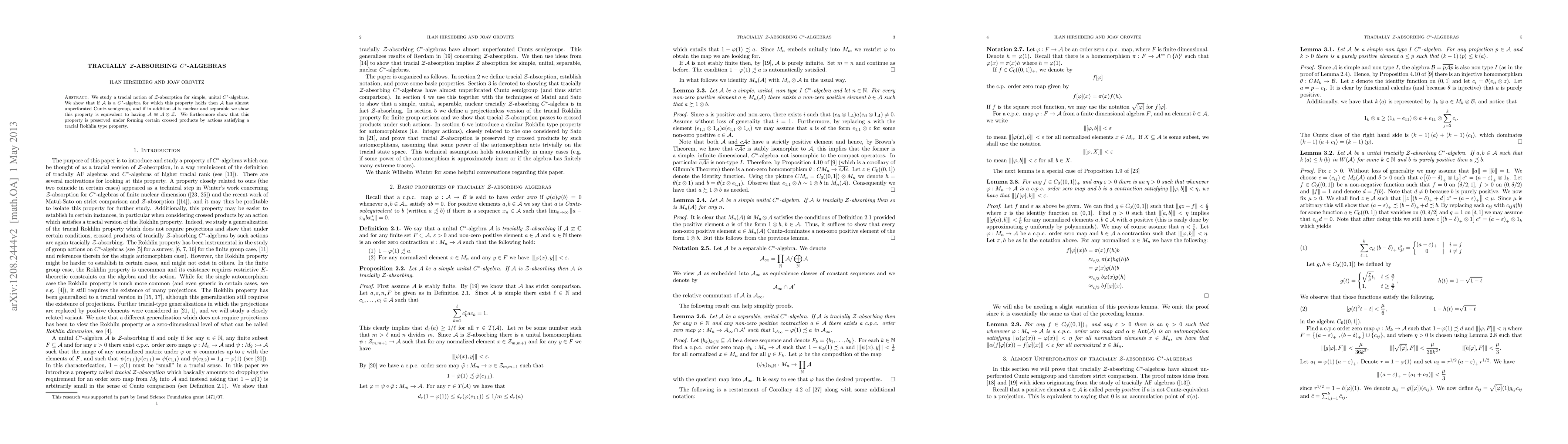 This research paper investigates a new property of simple, unital C*-algebras called Z-absorption, showing its equivalence to almost unperforated Cuntz semigroups in nuclear and separable cases, with preservation under certain crossed products.