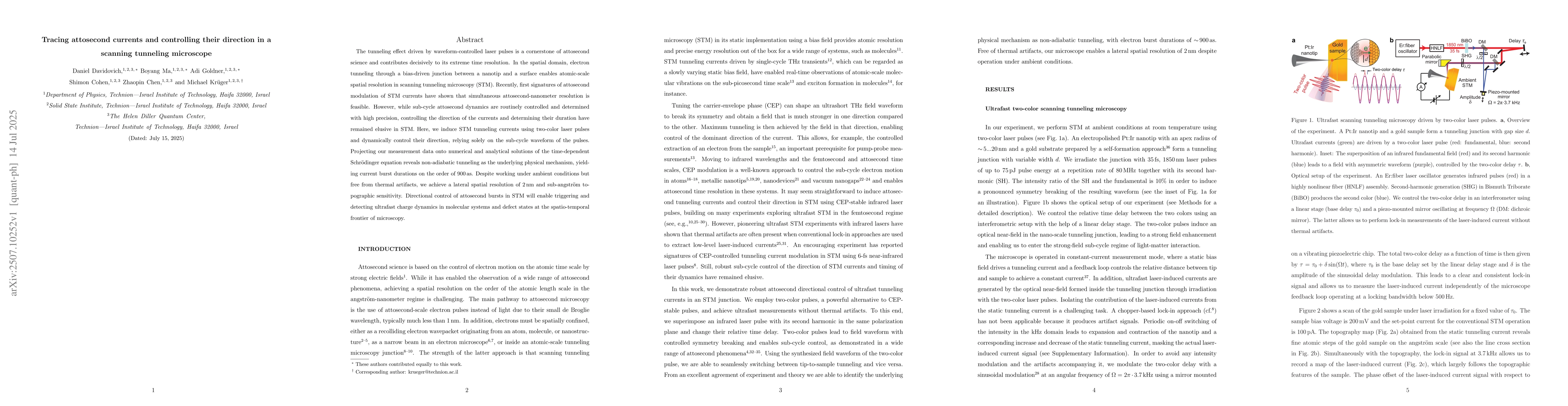The tunneling effect driven by waveform-controlled laser pulses is a cornerstone of attosecond science and contributes decisively to its extreme time resolution. In the spatial domain, electron tunneling through a bias-driven junction between a nanotip and a surface enables atomic-scale spatial resolution in scanning tunneling microscopy (STM). Recently, first signatures of attosecond modulation of STM currents have shown that simultaneous attosecond-nanometer resolution is feasible. However, while sub-cycle attosecond dynamics are routinely controlled and determined with high precision, controlling the direction of the currents and determining their duration have remained elusive in STM. Here, we induce STM tunneling currents using two-color laser pulses and dynamically control their direction, relying solely on the sub-cycle waveform of the pulses. Projecting our measurement data onto numerical and analytical solutions of the time-dependent Schr\"odinger equation reveals non-adiabatic tunneling as the underlying physical mechanism, yielding current burst durations on the order of 900 as. Despite working under ambient conditions but free from thermal artifacts, we achieve a lateral spatial resolution of 2 nm and sub-angstr\"om topographic sensitivity. Directional control of attosecond bursts in STM will enable triggering and detecting ultrafast charge dynamics in molecular systems and defect states at the spatio-temporal frontier of microscopy.