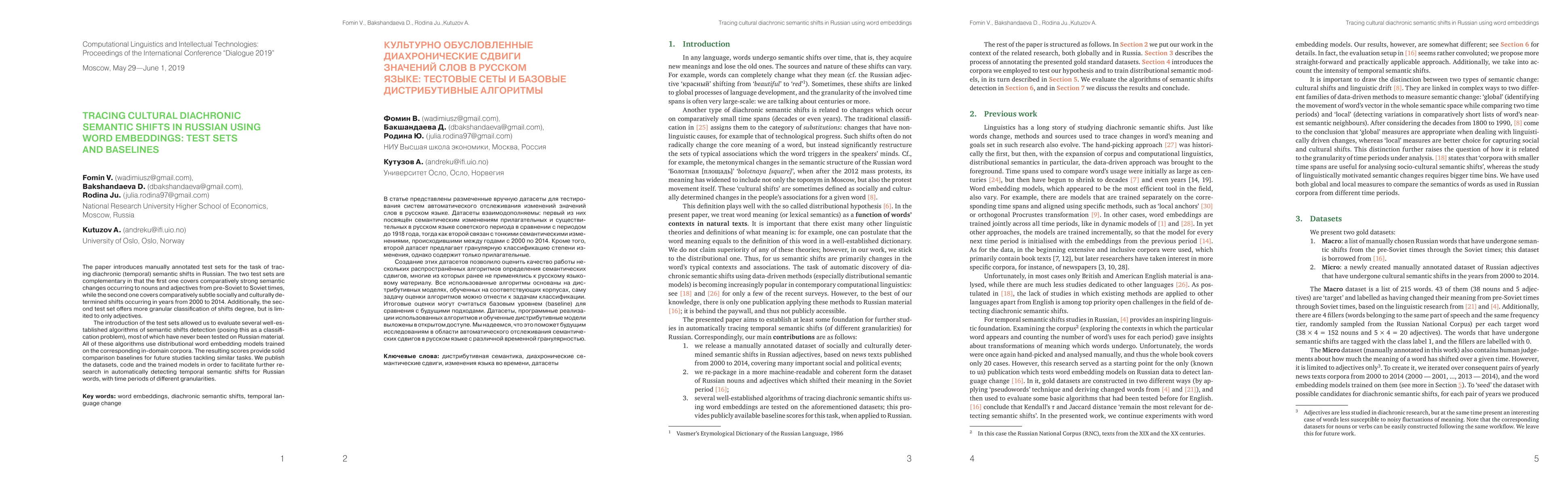 The paper presents two manually annotated test sets for detecting diachronic semantic shifts in Russian, evaluating several algorithms using word embeddings. The datasets facilitate future research on temporal semantic shifts, offering baselines for comparison.